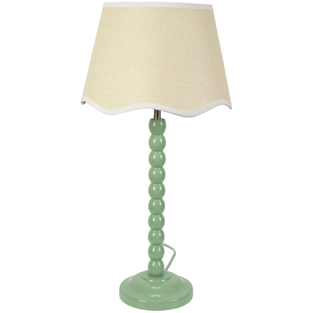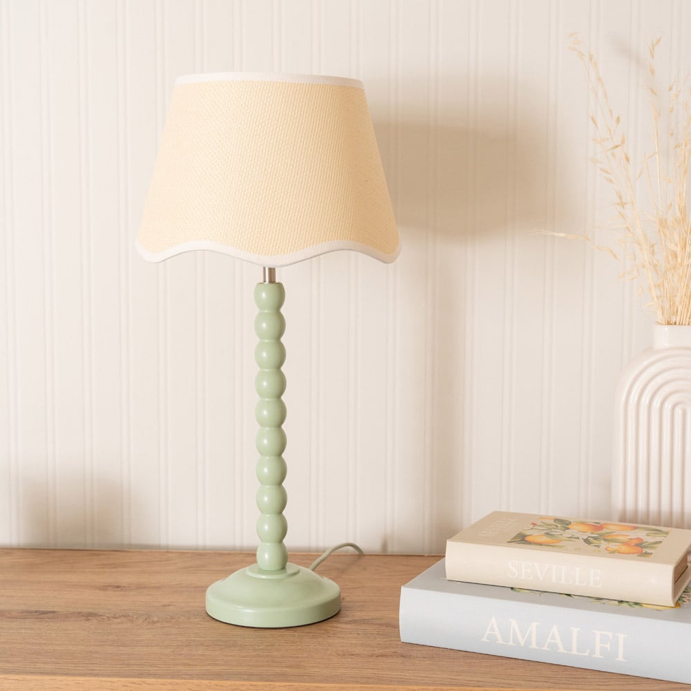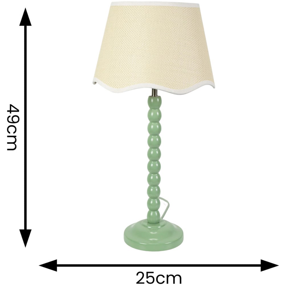 Elevate your space with the Bobbins Linen Table Lamp. This charming lamp features a stacked bobbin design in a soft sage green, creating a contemporary feel. A cream linen shade, accented with a crisp white scalloped edge, adds elegance and warmth. Ideal for living rooms or bedrooms, its convenient 1.5m cable and in-line rocker switch ensure effortless use. Complete with an LED bulb and a 12-month warranty, this lamp offers both style and peace of mind. Dimensions: H50 x W25 x D25cm.