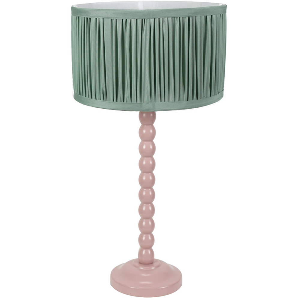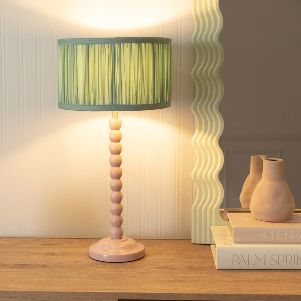 Illuminate your space with the Bobbins Ruched Pleated Green Drum Shade LED Table Lamp. Its charming stacked bobbin design and pastel green finish create a delightful accent for bedrooms and living rooms alike. The vibrant drum shade adds a touch of personality, perfectly complemented by the convenient 1.5m cable and inline rocker switch.