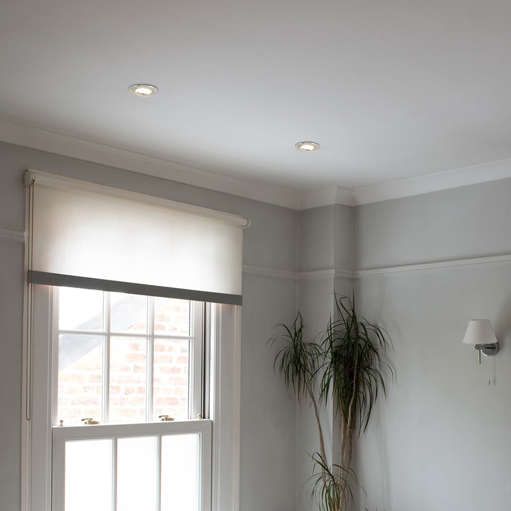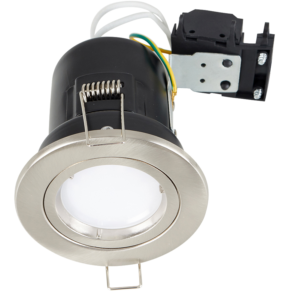 These four brushed chrome GU10 recessed downlights are fire-rated and designed for straightforward installation. Each light includes a terminal block, GU10 lamp holder, and mounting bracket, utilising a simple metal spring clip mechanism. Direct mains wiring is supported, no transformer is needed. Complete fitting instructions are provided. Compatible with both halogen and LED GU10 bulbs, this pack conveniently includes four warm white LED GU10 bulbs. Dimensions: 11cm (H) x 9cm (W) x 9cm (D.
