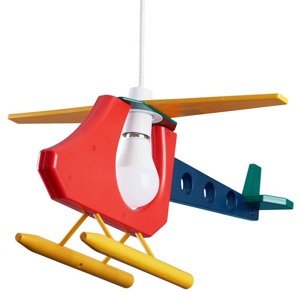 Update your child's room with this fun, multicoloured helicopter pendant light shade. Its vibrant 3D design in blue, yellow, green and red features landing gear and propellers for a playful touch. The bulb is cleverly positioned inside the aircraft cockpit, adding to the fun. Requires one 60w BC B22 GLS bulb (not included). Dimensions: H21 x W50 x D40cm. Important: This is not a toy and must be kept out of children's reach.