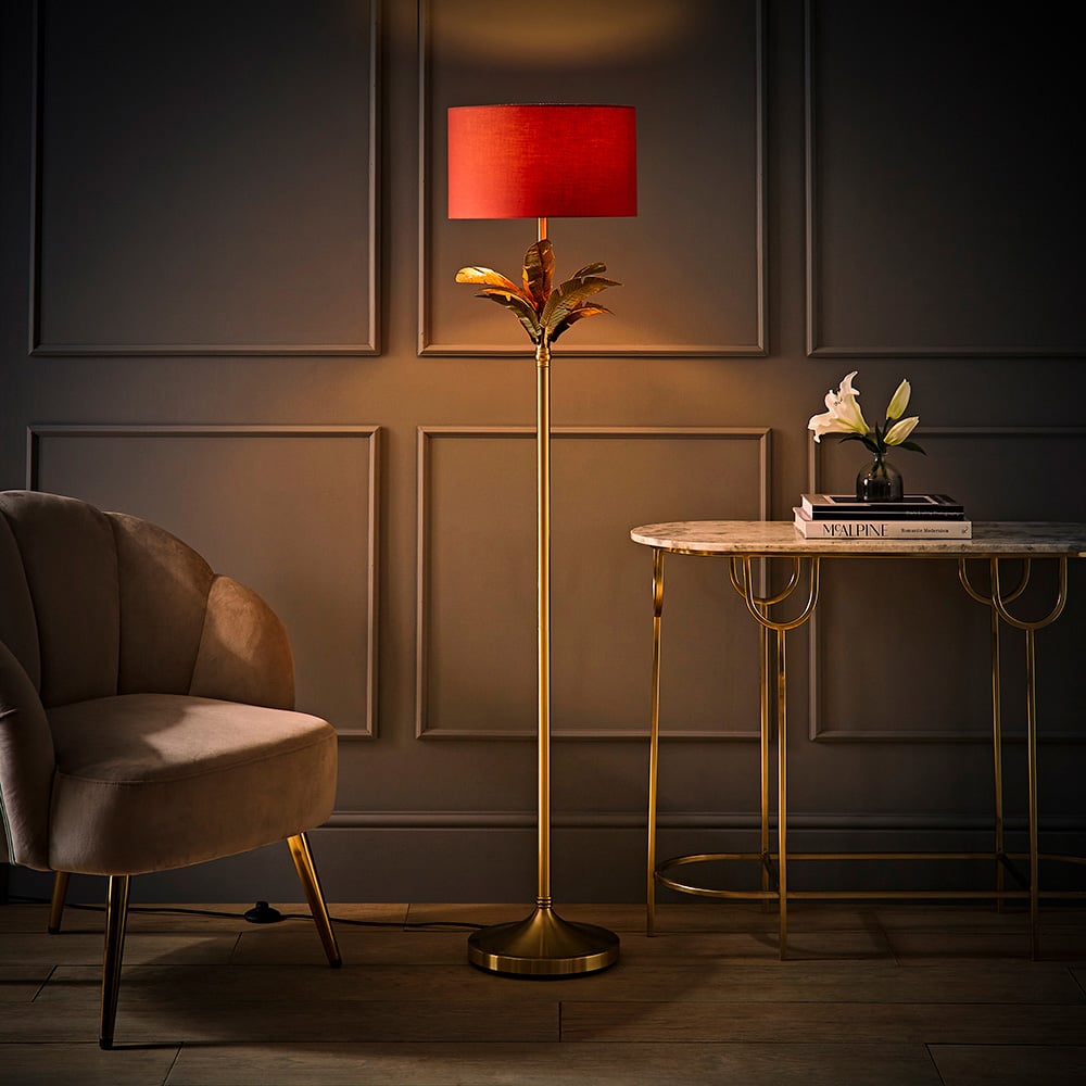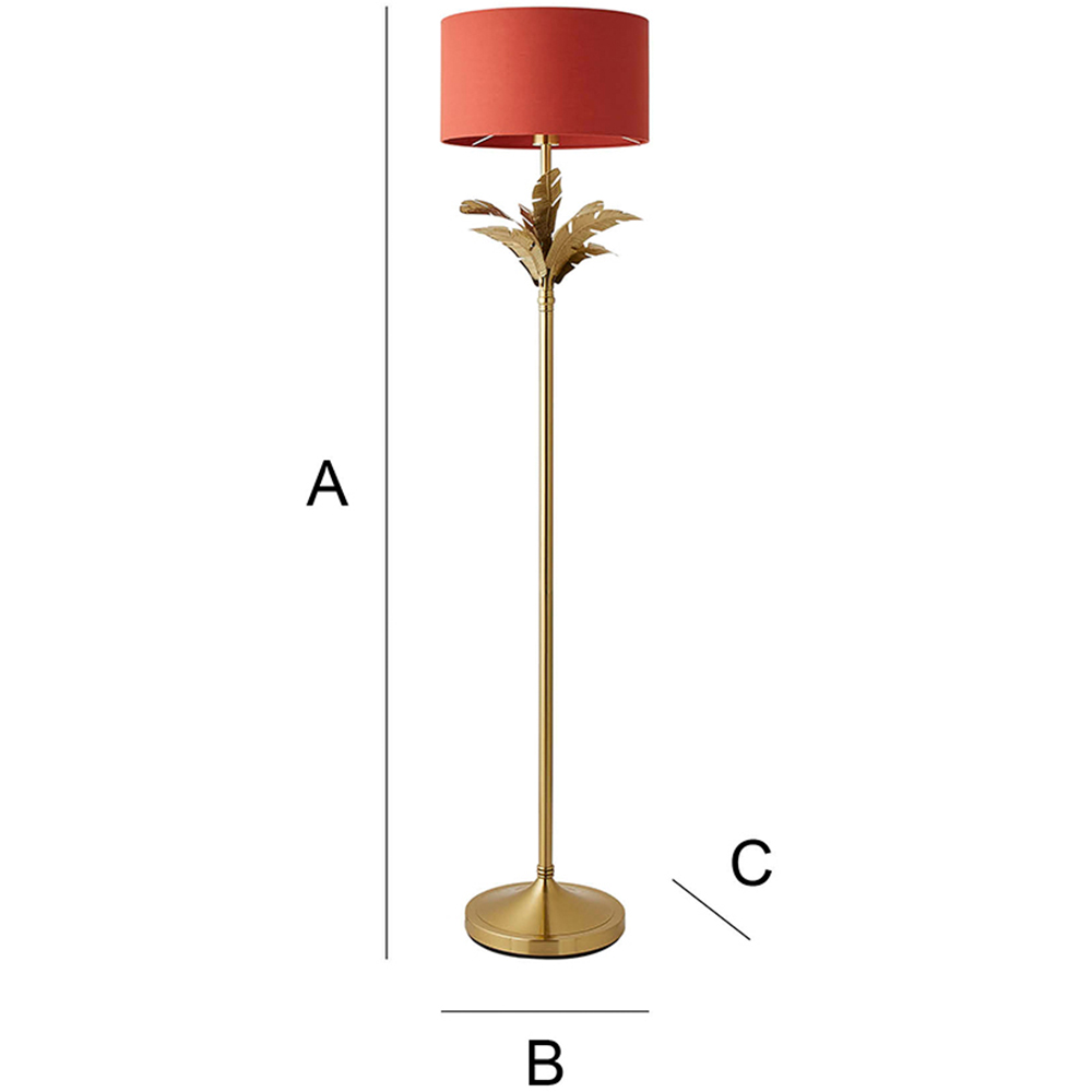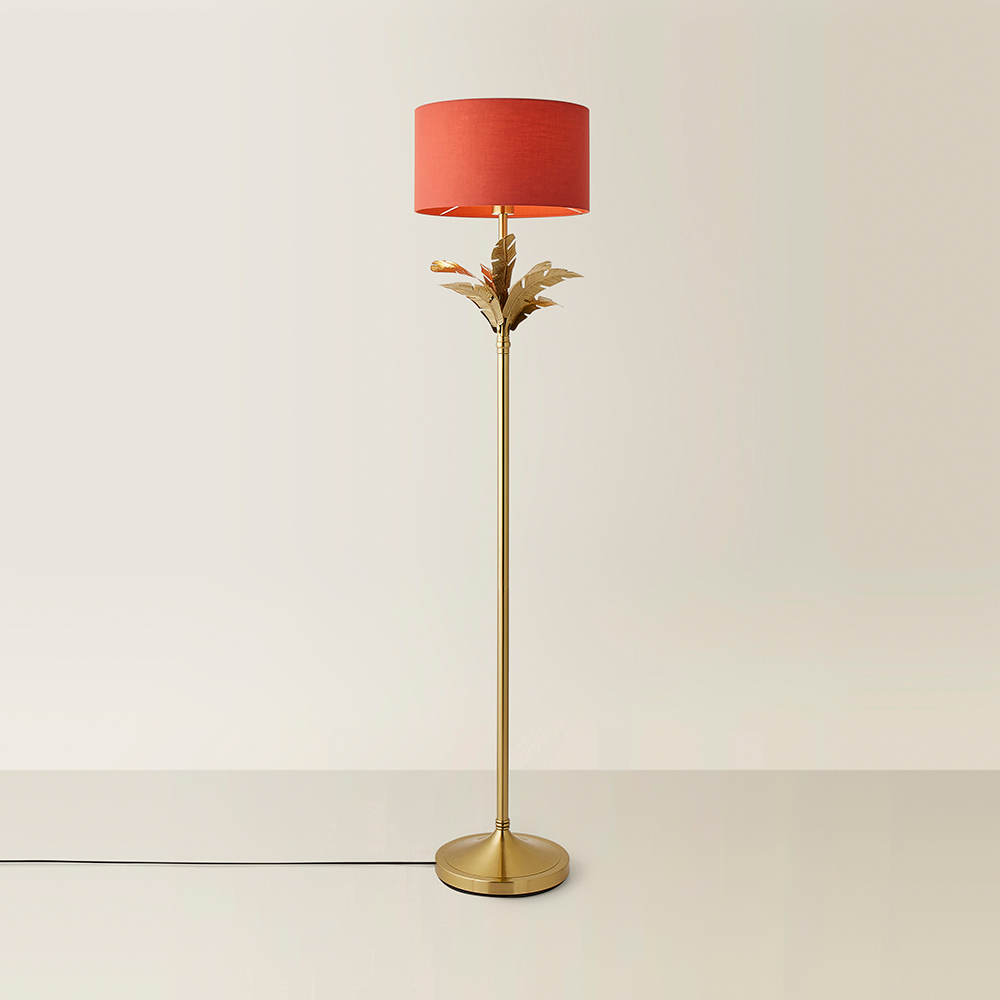 Infuse your living space with the Christina Rust Red Drum Shade Floor Lamp, where elegance meets a touch of jungle charm. The luxurious gold palm leaf single stem design makes it easy to create a perfectly tropical ambience. This floor lamp features a rust-red fabric shade, embodying both sophistication and warmth. Ready to illuminate your space with a cosy glow, Christina includes a suitable LED bulb, ensuring immediate enjoyment upon setup.