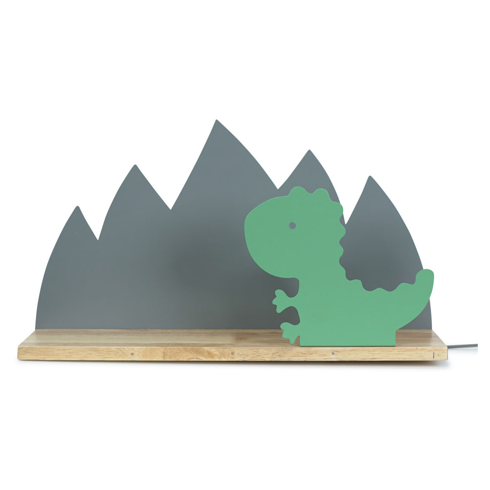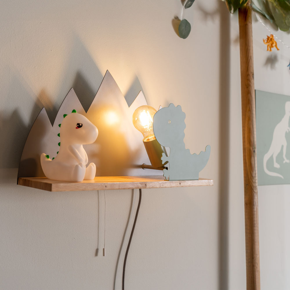 Add a playful touch to your child's room with this dinosaur-shaped wall light and shelf. Simply plug it in and use the pull switch for a soft, diffused glow, perfect for bedtime stories or a calming nightlight. The integrated shelf provides a charming spot for small treasures. Dimensions: H26 x W46 x D12cm.