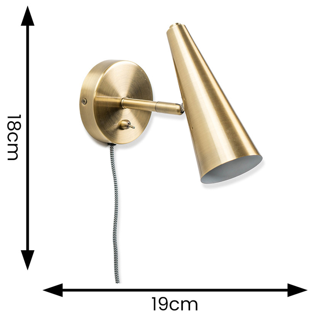 Elevate your living space with this pair of plug-in wall lights, ideal for living rooms, bedrooms, or quiet reading nooks. Their brushed antique brass finish and striking metal design seamlessly blend with both modern and traditional interiors. The adjustable cone head allows for precise light direction, making them perfect task lamps for home offices, student rooms, or anywhere focused illumination is needed – from reading to homework. A timeless addition to any home. Dimensions: H17 x W10 x D21cm.