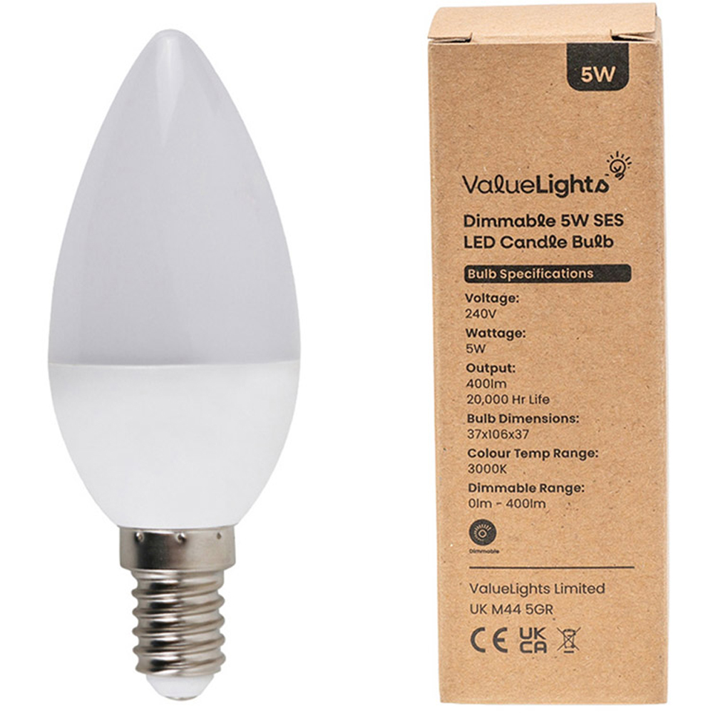 Discover long-lasting illumination with this pack of ten ValueLights 5W E14 Candle LED Light Bulbs. Emitting a warm white 3000K glow, these dimmable bulbs are an energy-efficient choice, consuming just 5W while providing the equivalent light output of a 40W standard bulb. Ideal for use in kitchens, dining rooms, living rooms, bedrooms, hallways and beyond, these bulbs boast an impressive 20,000-hour lifespan, offering significant long-term savings.