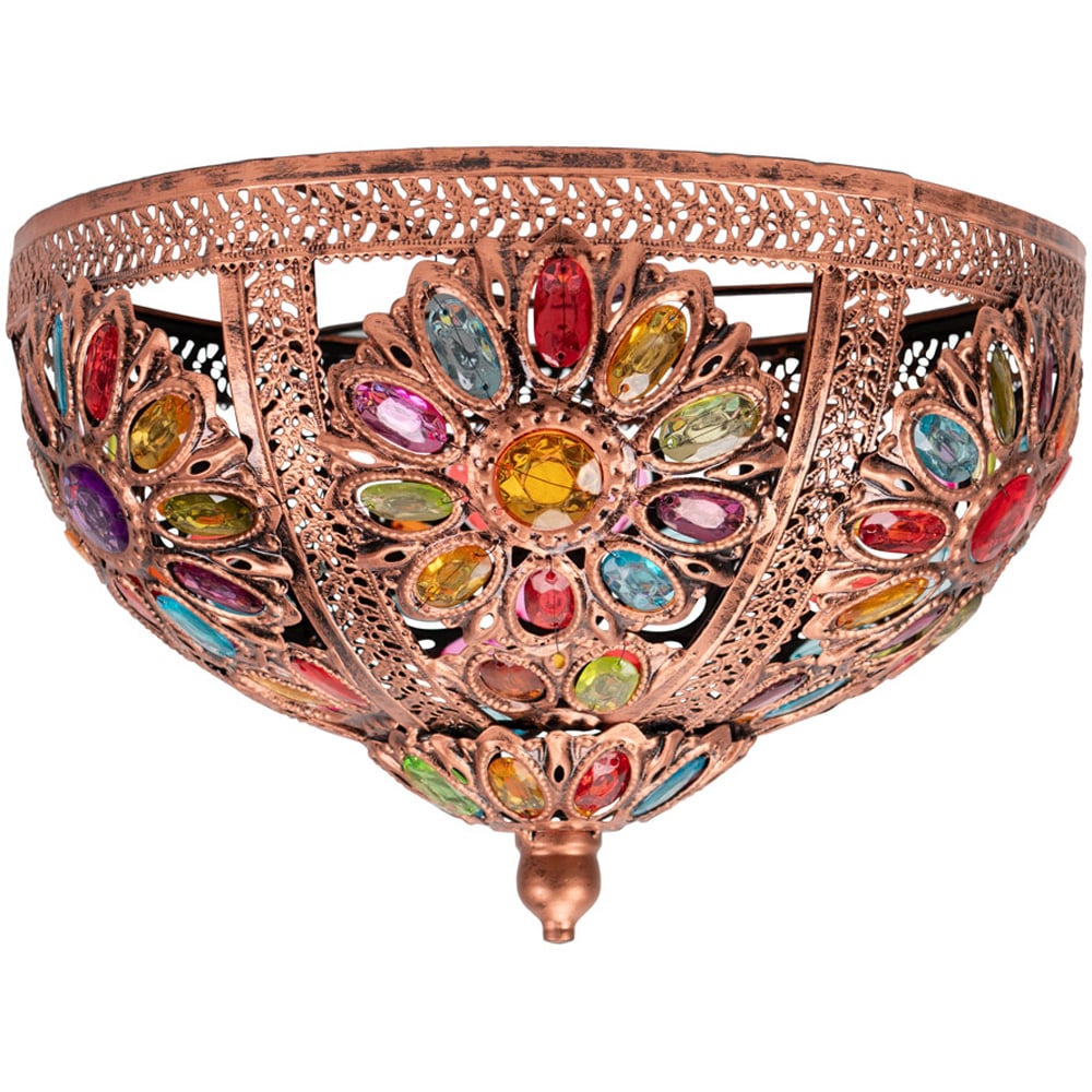 Enhance your home's ambiance with the Samia Moroccan-style bronze uplighter lamp shade. Intricate detailing and a rich bronze finish, accented with multi-coloured jewels, create a luxurious statement piece. This unique, Moroccan-inspired design effortlessly adds elegance to any room. The easy-fit design allows for a quick style update without needing an electrician. Dimensions: H23 x D34cm.