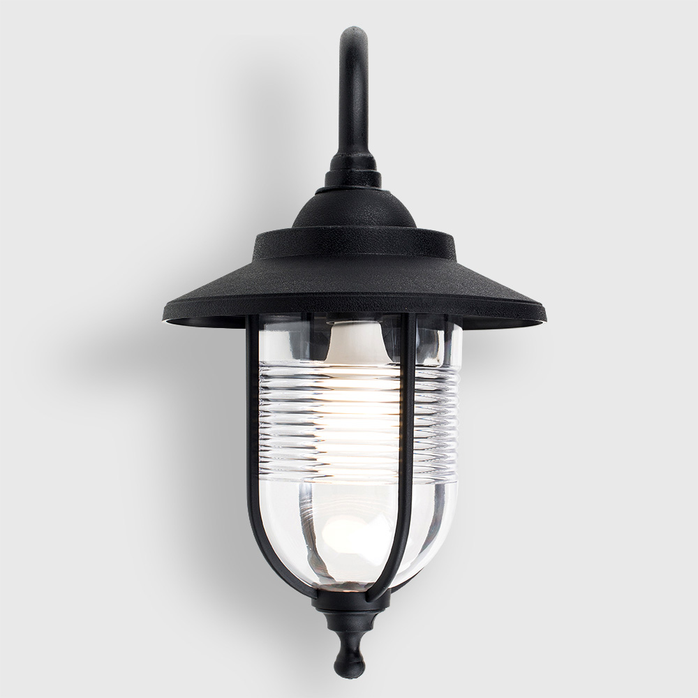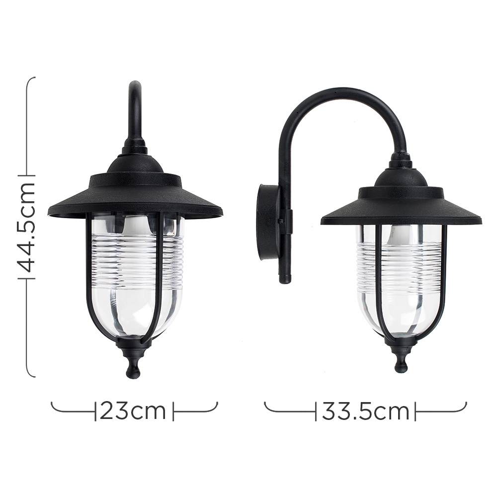 Enhance your outdoor spaces with the Eyam Black Outdoor Swan Neck Wall Lantern. This stylish fisherman's wall lamp features a sleek black finish and durable, weather-resistant resin construction with a clear shade. Perfect for illuminating gardens, patios, courtyards, driveways, porches, conservatories, or even indoor areas, this IP44-rated lantern is fully certified for outdoor use. A six-watt warm white LED bulb is included, making it ready to install and brighten your home instantly.