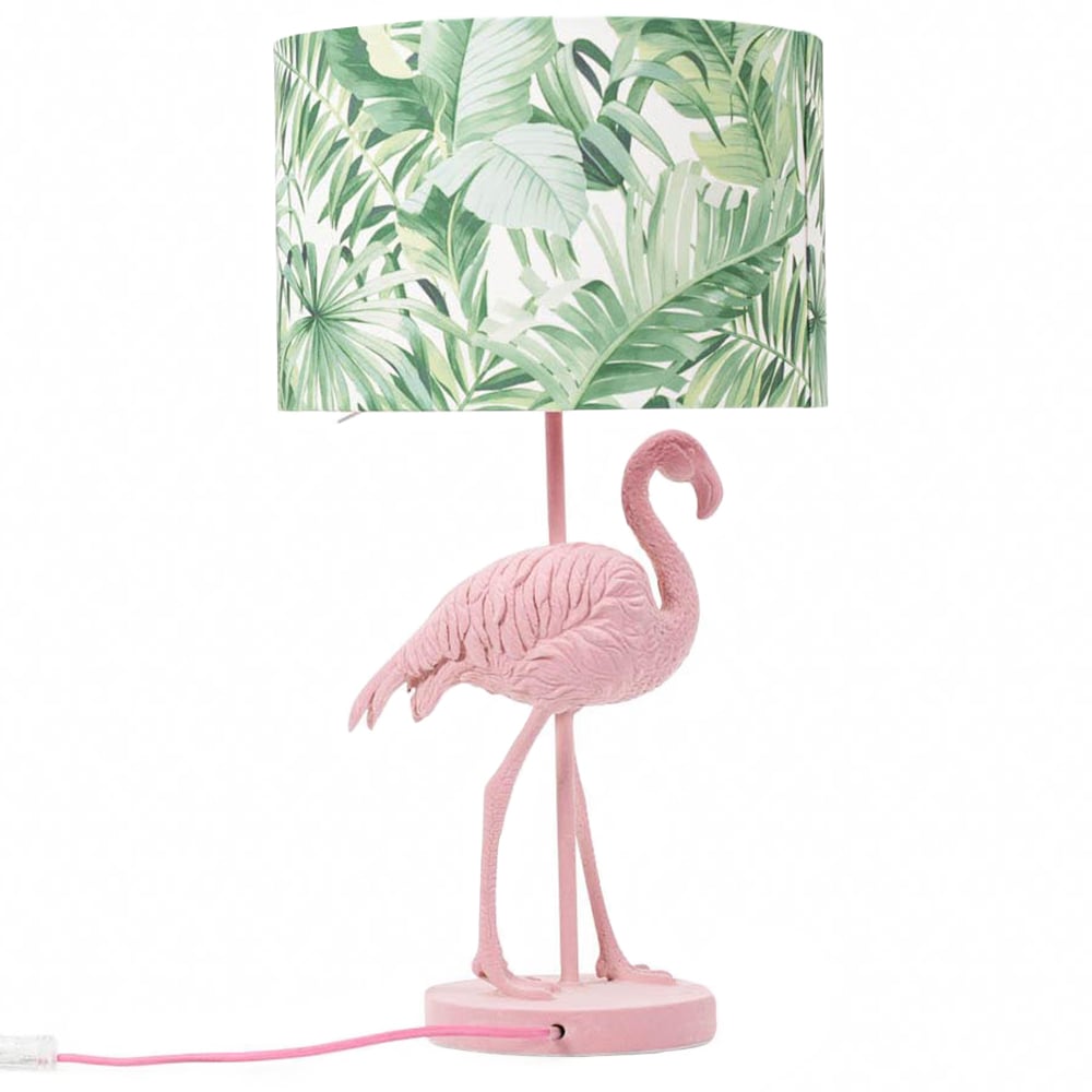 Brighten your space with this eye-catching flamingo table lamp. Its pink velvet finish and tropical palm leaf lampshade create a vibrant, playful atmosphere, instantly transforming any room. Conveniently controlled by an in-line rocker switch, this unique lamp adds personality and style, making it a showstopping addition to your home décor.