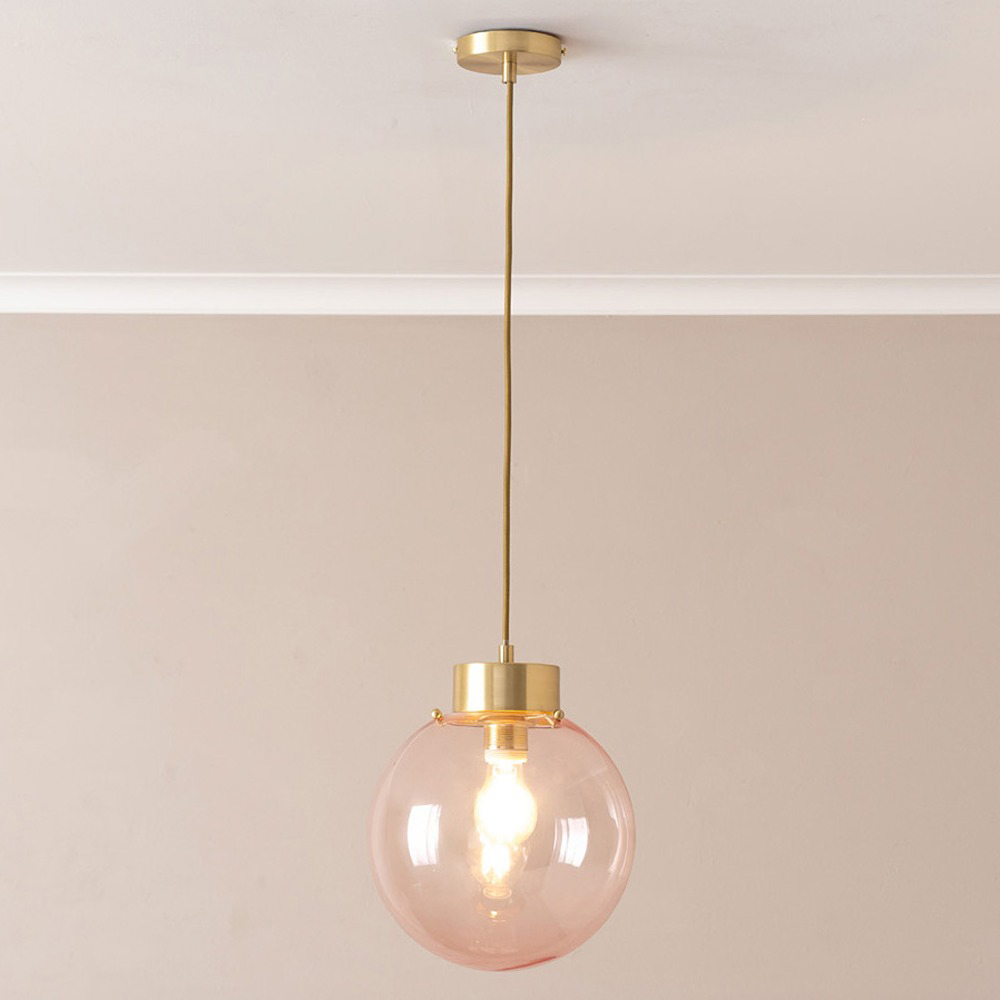 A harmonious blend of grace and practicality, the 'Frenchie Pink Glass Globe Brushed Gold Capped Ceiling Pendant Light with Bulb' is sure to enhance your living space. The soft pink glass shade emits a welcoming radiance, ideal for crafting a warm ambience in any room. Complemented by a brushed gold cap for added refinement, this ceiling light is a superb match for both contemporary and classic interior designs. Complete with an energy-efficient LED bulb, this pendant light offers both style and immediate illumination upon installation.