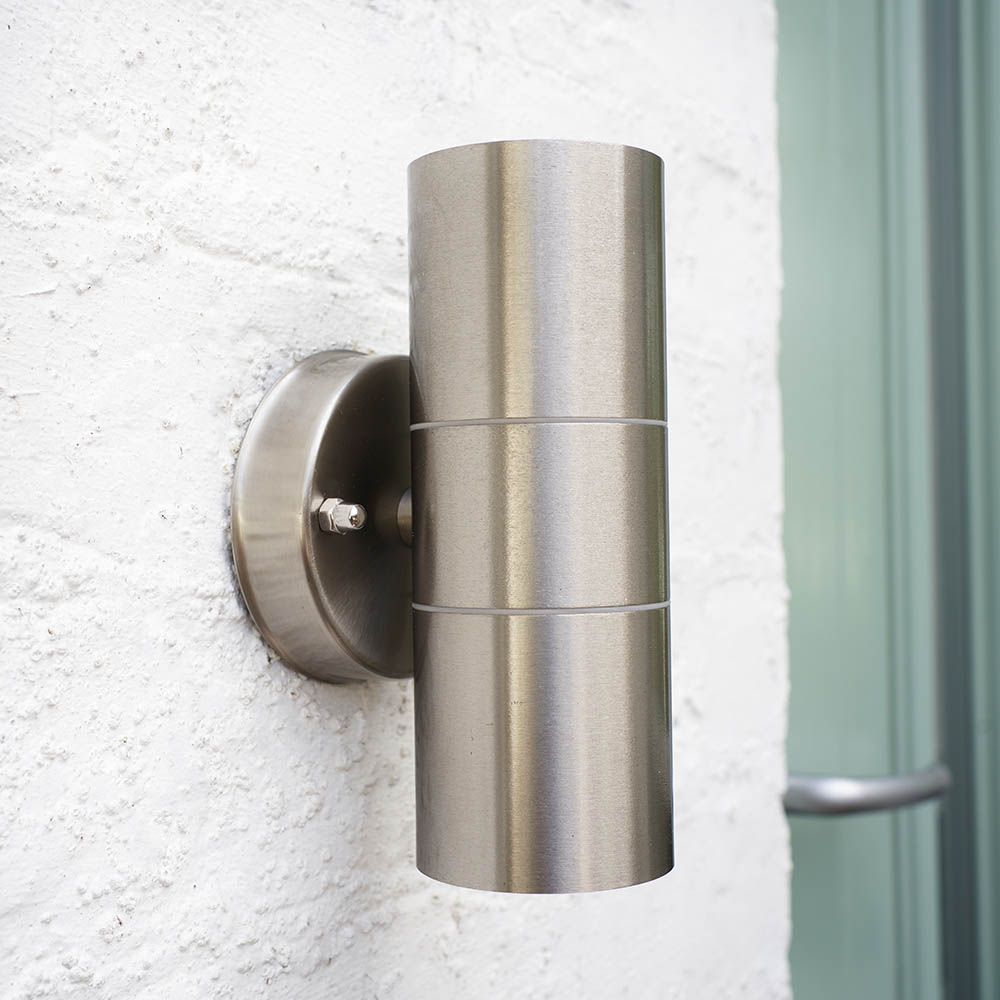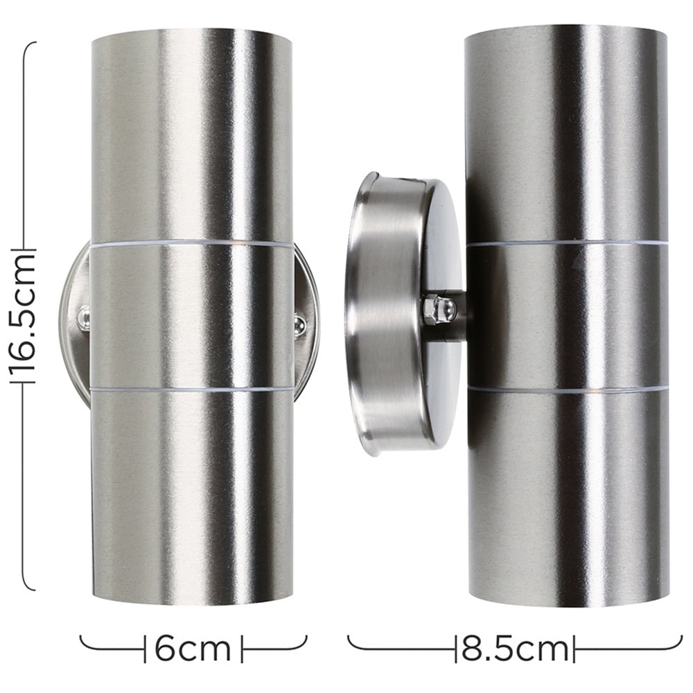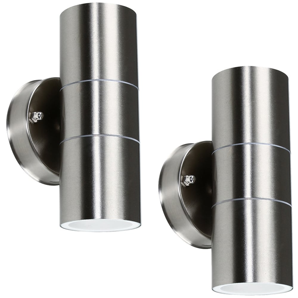 Add a touch of elegance to your home's exterior with the Gainsford Set of 2 Silver Warm White Bulb Wall Up-Down Lights. These modern, brushed chrome lights boast a sleek, flush cylinder design, ideal for illuminating gardens, paths, garages, patios, courtyards, porches, and driveways. Durable and weatherproof (IP44 rated), these lights offer both practical illumination and enhanced security. Each fixture includes a 5W warm white LED bulb, ready for immediate installation. Enjoy the bright, up and down lighting that creates a welcoming ambiance.