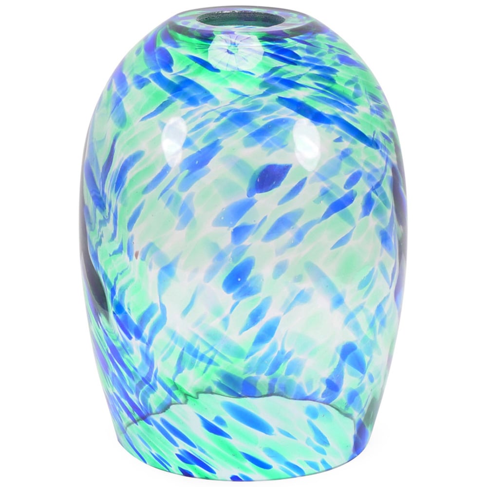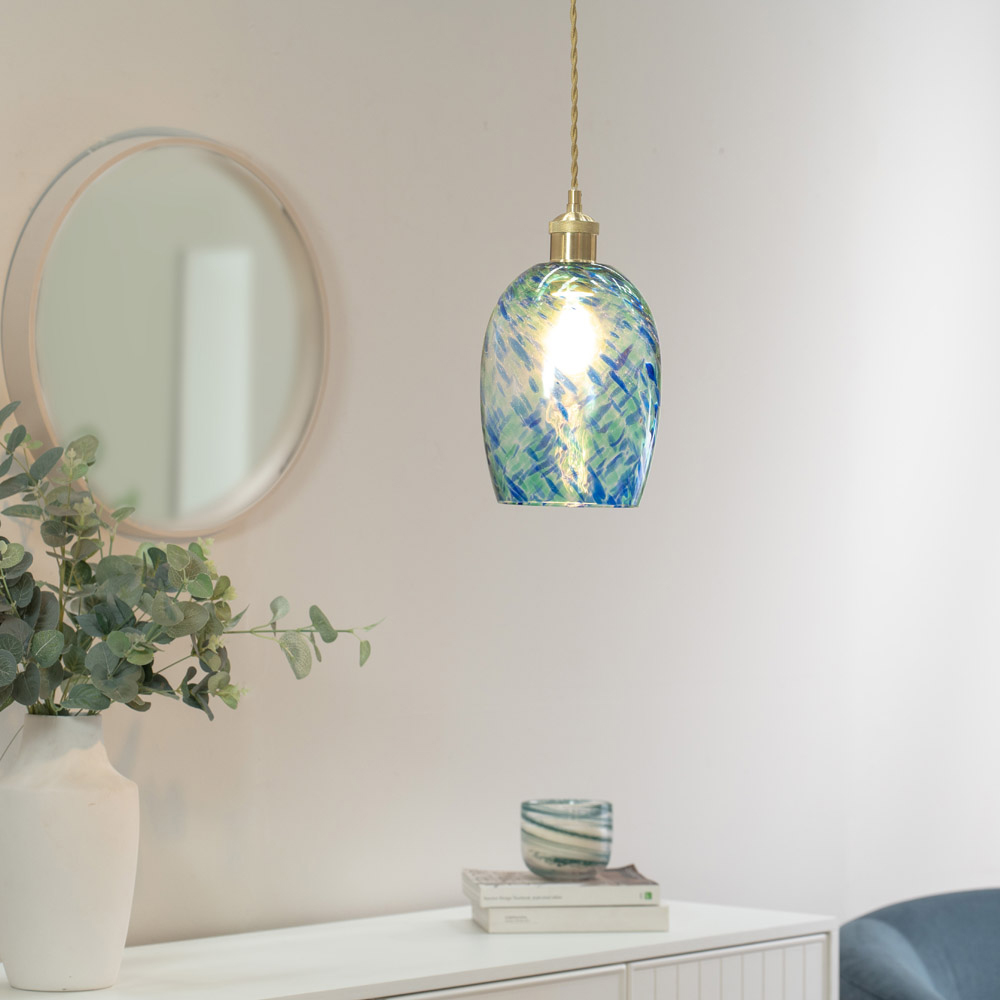 Enhance your home's ambiance with the India Green Gold Confetti Glass Pendant Shade. This elegant green glass shade, accented with gold metal, is ideal for high ceilings. By day, it lets natural light filter through, by night, it beautifully diffuses the glow of your bulb, its confetti design adding a captivating sparkle. Easily installed on standard ceiling pendants, it offers a quick and stylish update for any room. A subtle yet sophisticated focal point for living rooms, hallways, or bedrooms, this shade requires only a gentle wipe with a dry cloth for cleaning. A 12-month warranty is included.