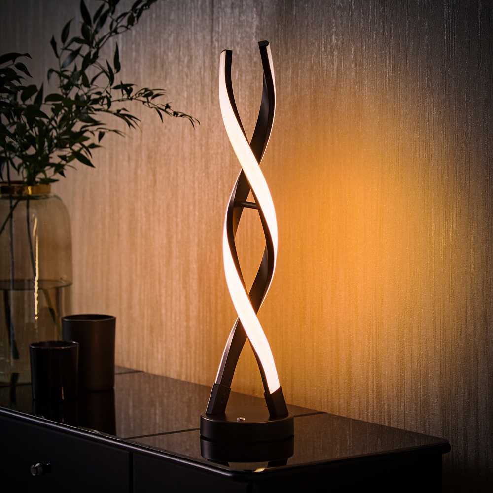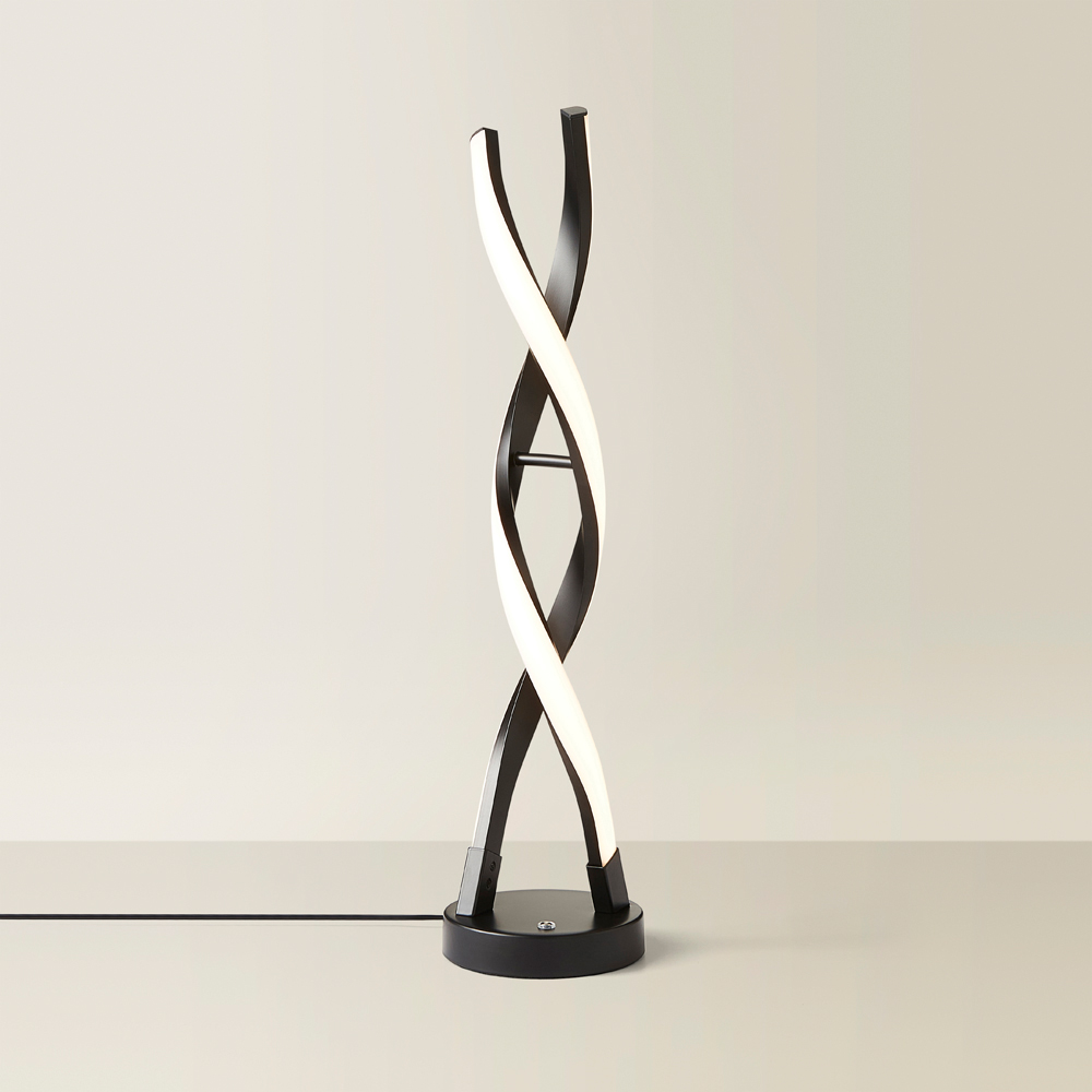 A modern miracle of interior decor. The Infinity LED Double Twist Touch Lamp in matte black includes integrated LED lighting that'll twist and turn everyone's attention and dim along with your energy levels into the evening. Add a touch of pizzazz to a minimalist home or match up seamlessly with a modern one. LED integrated with a lifespan of approximately 25,000 hours. A real statement piece, with a 10% - 100% dimming function, just a long press of the power button. Crafted from a sturdy combination of metal and PVC in a sophisticated matte black finish. LED colour temperature is 3000k warm white, a warm and vibrant shine. Dimensions: H48 x W12 x D12cm.