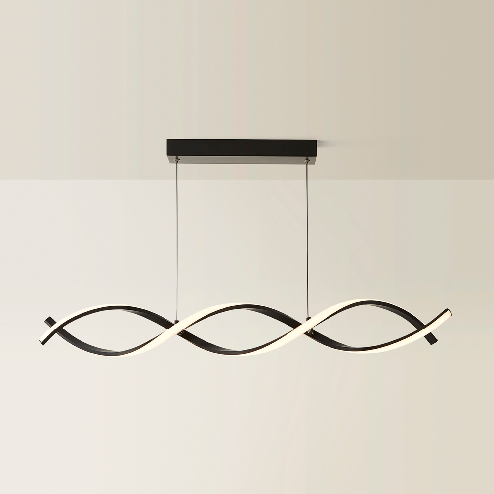 A modern miracle of interior decor. The Infinity LED Double Twist Floor Lamp in matte black includes integrated LED lighting that'll twist and turn everyone's attention. Add a touch of pizzazz to a minimalist home or match up seamlessly with a modern one. Adjustable cable length for the perfect fit above a dining table or kitchen island, with a ceiling plate diameter of 34cm, that's a solid foundation. LED integrated with a lifespan of approximately 25,000 hours. A real statement piece that has been crafted from a sturdy combination of metal and PVC in a sophisticated matte black finish, and fitted with a foot switch for ease of use. LED colour temperature is 3000k warm white, a warm and vibrant shine. Dimensions: H100 x W97 x D12cm.