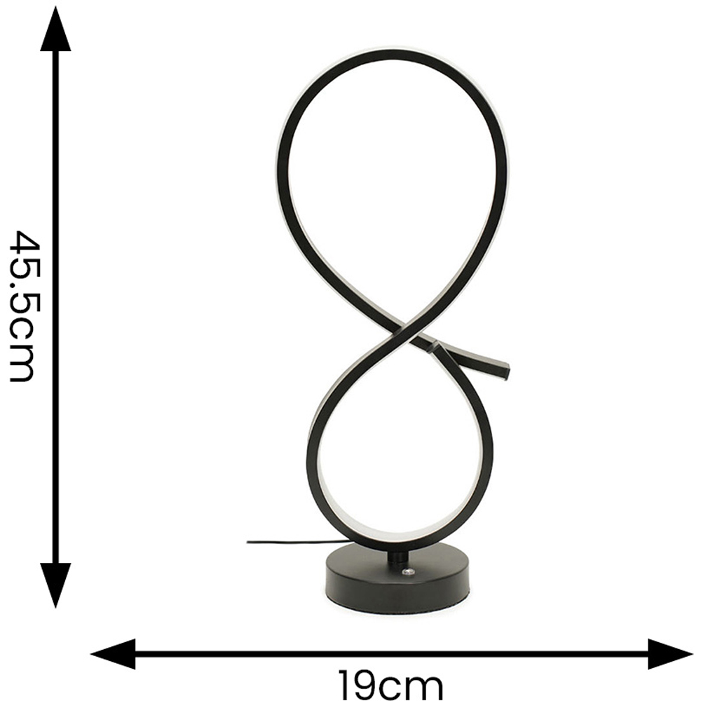 A modern miracle of interior decor. The Infinity LED Swirl Touch Table Lamp in matte black. With integrated LED, it's a table lamp that'll twist and turn everyone's attention. Add a touch of pizzazz to a minimalist home or match up seamlessly with a modern one. LED integrated with a lifespan of approximately 25,000 hours. A real statement piece, crafted from a sturdy combination of metal and PVC in a sophisticated matte black finish and fitted with an easy-to-use touch button. LED colour temperature is 3000k warm white, a warm and vibrant shine. Dimensions: H45 x W19 x D12cm.