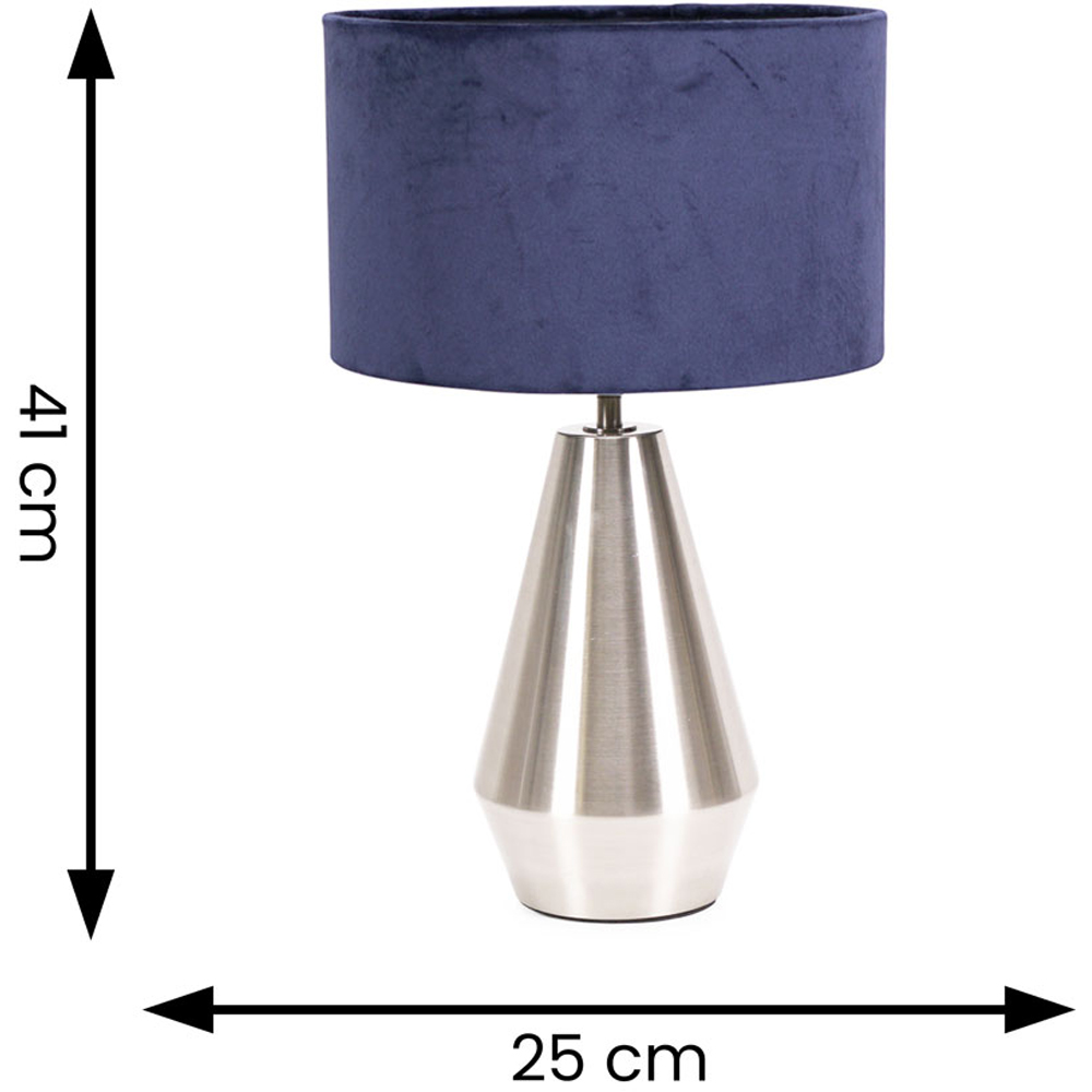 The Jax Brushed Chrome Touch LED Table Lamp adds a touch of elegance to your home. This stylish lamp boasts a sleek, tapered base in a brushed chrome finish and a luxurious blue velvet shade. Convenient touch on/off functionality makes it perfect for bedside or side tables. Simply wipe clean with a dry cloth. Includes a 12-month warranty.