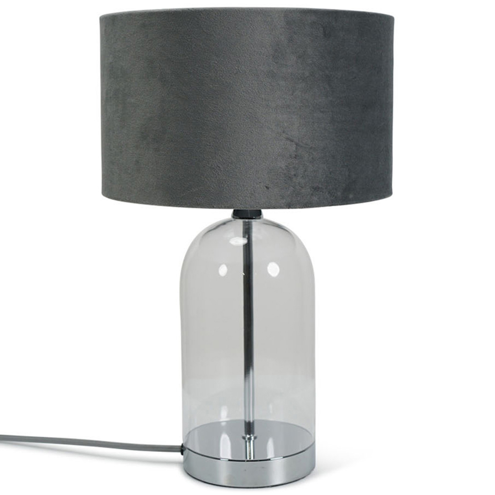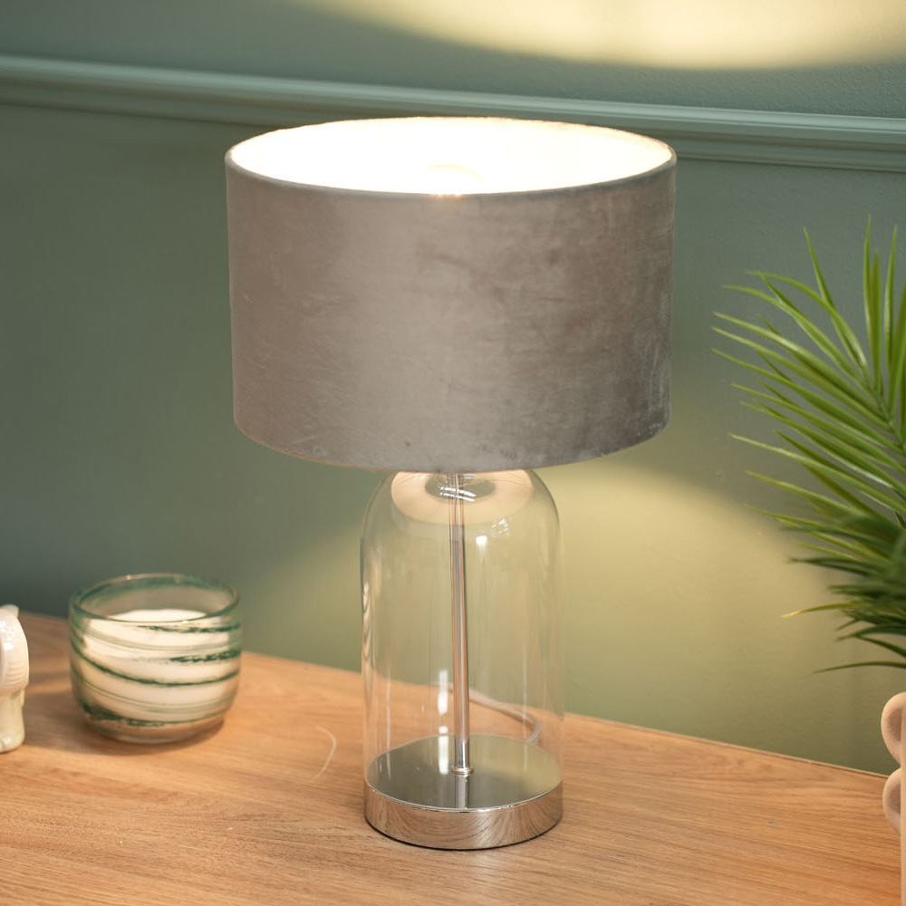 Elevate your space with this exquisite table lamp. Its clear glass base, accented by a silver chrome trim, offers a timeless appeal. The clean, modern design complements diverse styles, from vintage charm to minimalist chic, making it a versatile addition to any room. A grey velvet drum lamp shade completes the look.