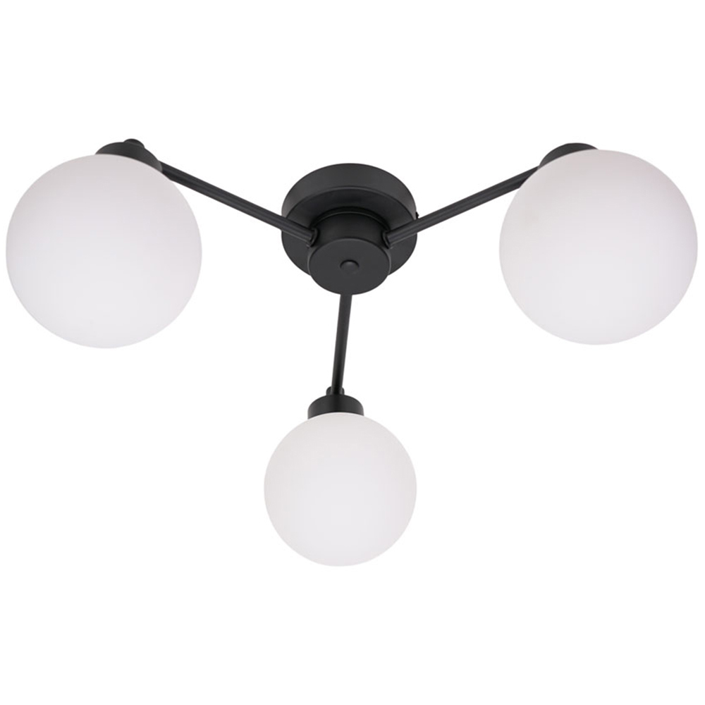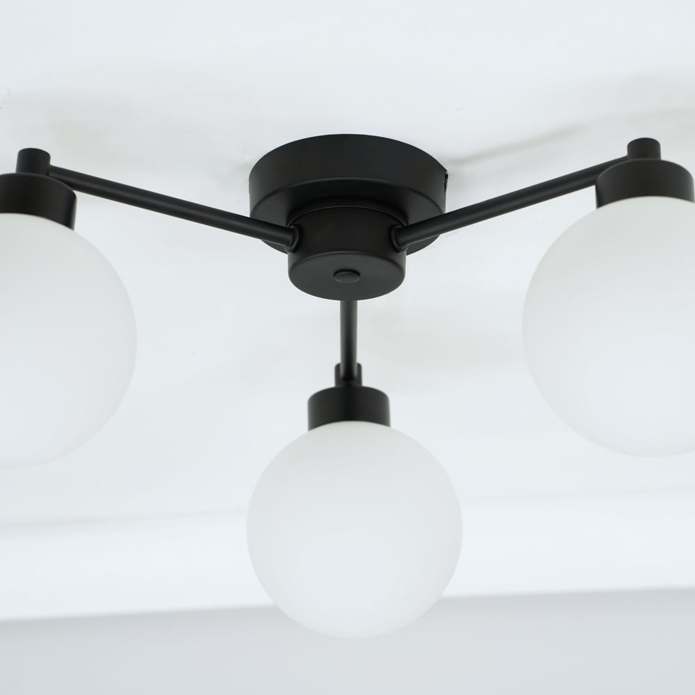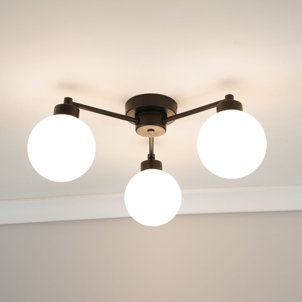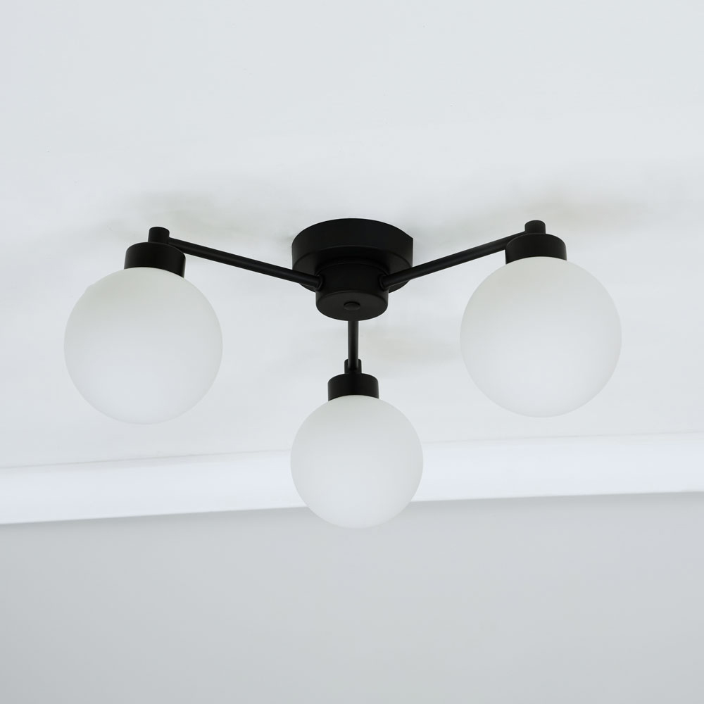 The Jonah Matt Black 3-Arm Globe Ball Shade Flush LED Ceiling Light brings minimalist style to your home. Featuring three arms and opal globe shades, this fixture offers a contemporary twist on retro design. Its sleek black finish complements any modern interior. Enjoy peace of mind with our 12-month warranty.