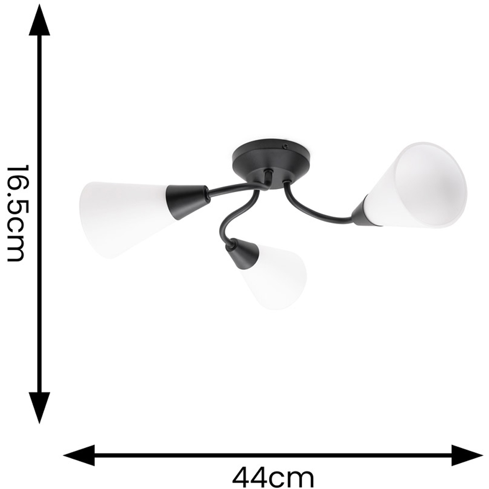 The Kristina 3-Way LED ceiling light adds a touch of modern elegance to any room. This stylish black metal flush mount fixture features three frosted white shades, diffusing light to create a warm and inviting ambiance. Enjoy powerful three-way lighting options, perfect for brightening and uplifting your space. Its low-profile design is ideal for any ceiling height, while the easy-to-clean surface simply requires a wipe with a dry cloth. Backed by a 12-month warranty.