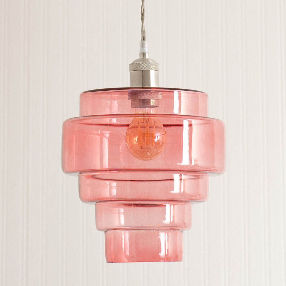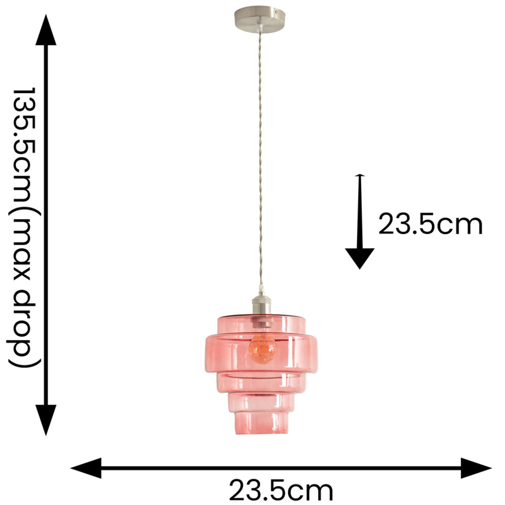 Breathe new life into your home with the Lane Pink Glass 5 Tier Shade Brushed Chrome Single Ceiling Pendant Light & Bulb. This eye-catching ceiling light artfully combines contemporary brushed chrome with the gentle, diffused light of five pink glass tiers. Perfect for kitchens and dining rooms, this fitting will infuse your space with warmth and sophistication. The included LED bulb ensures you can enjoy its beauty and functionality straight away. Its sleek design will be a talking point for all who visit.
