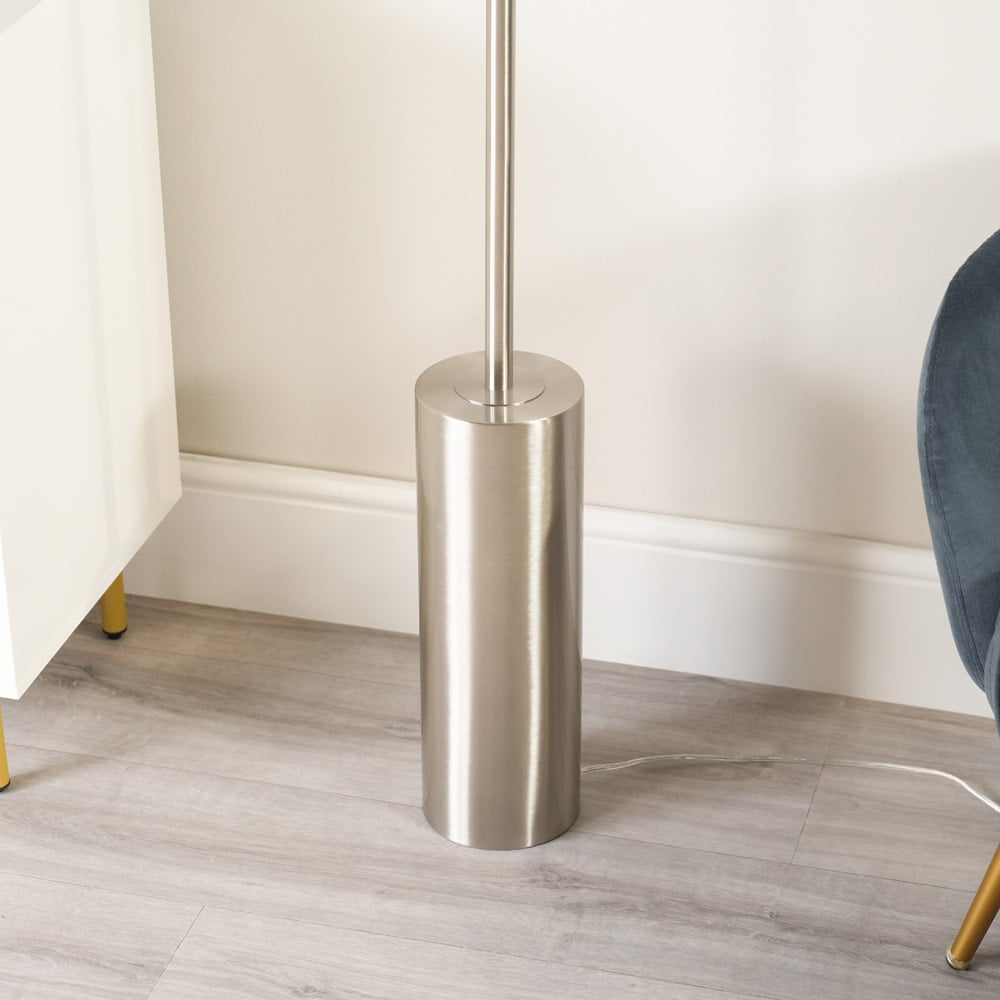 The Lexy Chrome Dimmable LED Floor Lamp adds a touch of modern luxury to any room. This stylish floor lamp boasts a brushed chrome finish and a navy black velvet drum shade for an elegant contrast. Its clean lines and contemporary design effortlessly enhance your home's ambiance, whether in the living room, bedroom, dining room, or hallway. Enjoy the perfect lighting with its convenient dimmable LED feature.