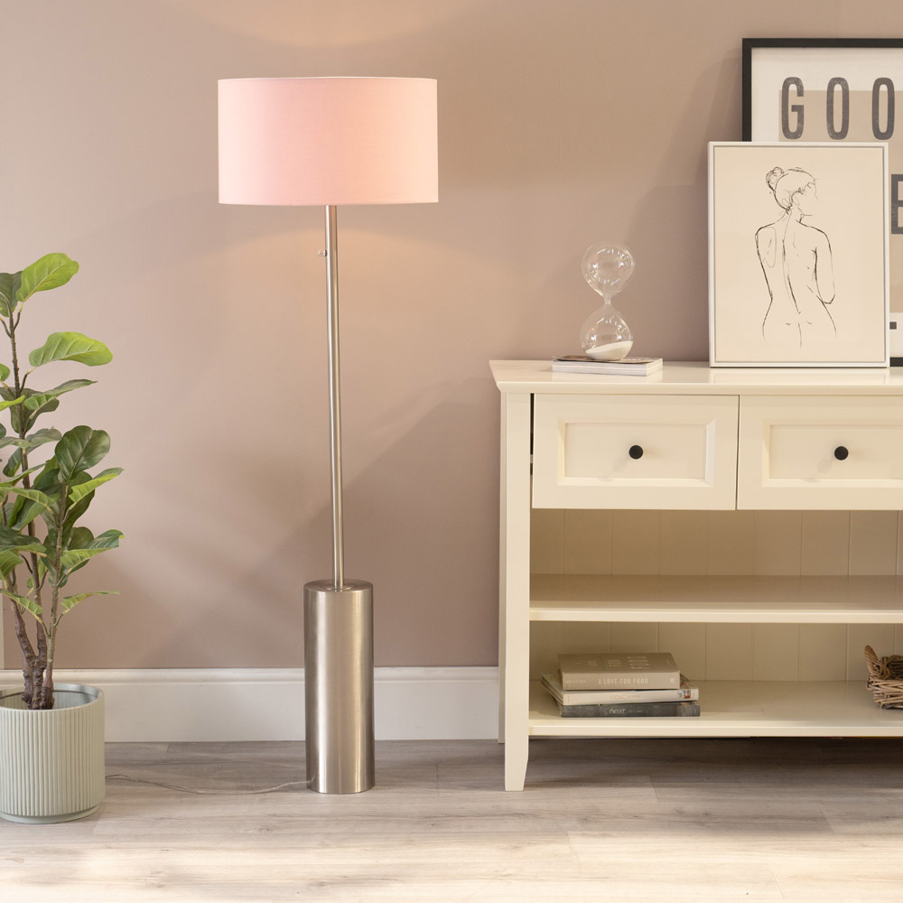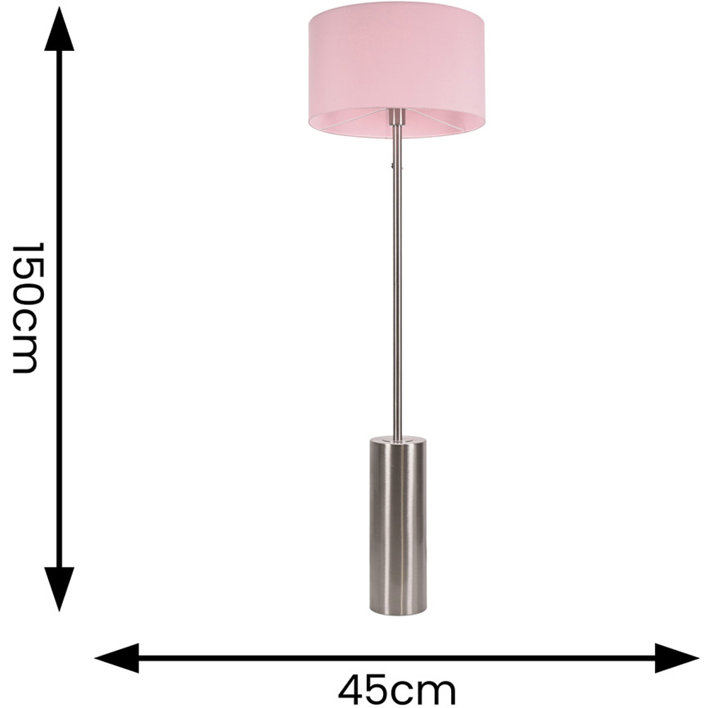 The Lexy Chrome Dimmable LED Floor Lamp adds a touch of modern elegance to your home. This brushed chrome floor lamp features a beautiful blush pink Reni fabric drum shade, creating a sophisticated ambiance. Its clean lines and contemporary design complement a variety of interior styles, making it ideal for living rooms, bedrooms, dining rooms, or hallways. Enjoy the luxurious look and adjustable brightness of this dimmable LED lamp.