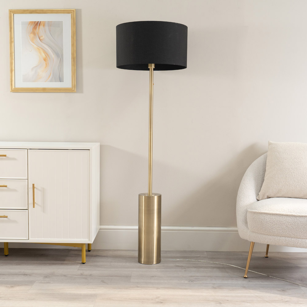The Lexy Reni floor lamp adds both style and function to your living space. A beautiful black fabric Reni shade complements the sleek antique brass base, creating a sophisticated look. Enjoy the convenience of touch-dimmable lighting, easily adjusting the brightness to suit your needs. This freestanding lamp is simple to clean with a dry cloth and includes an LED bulb. Your purchase is protected by a one-year warranty.