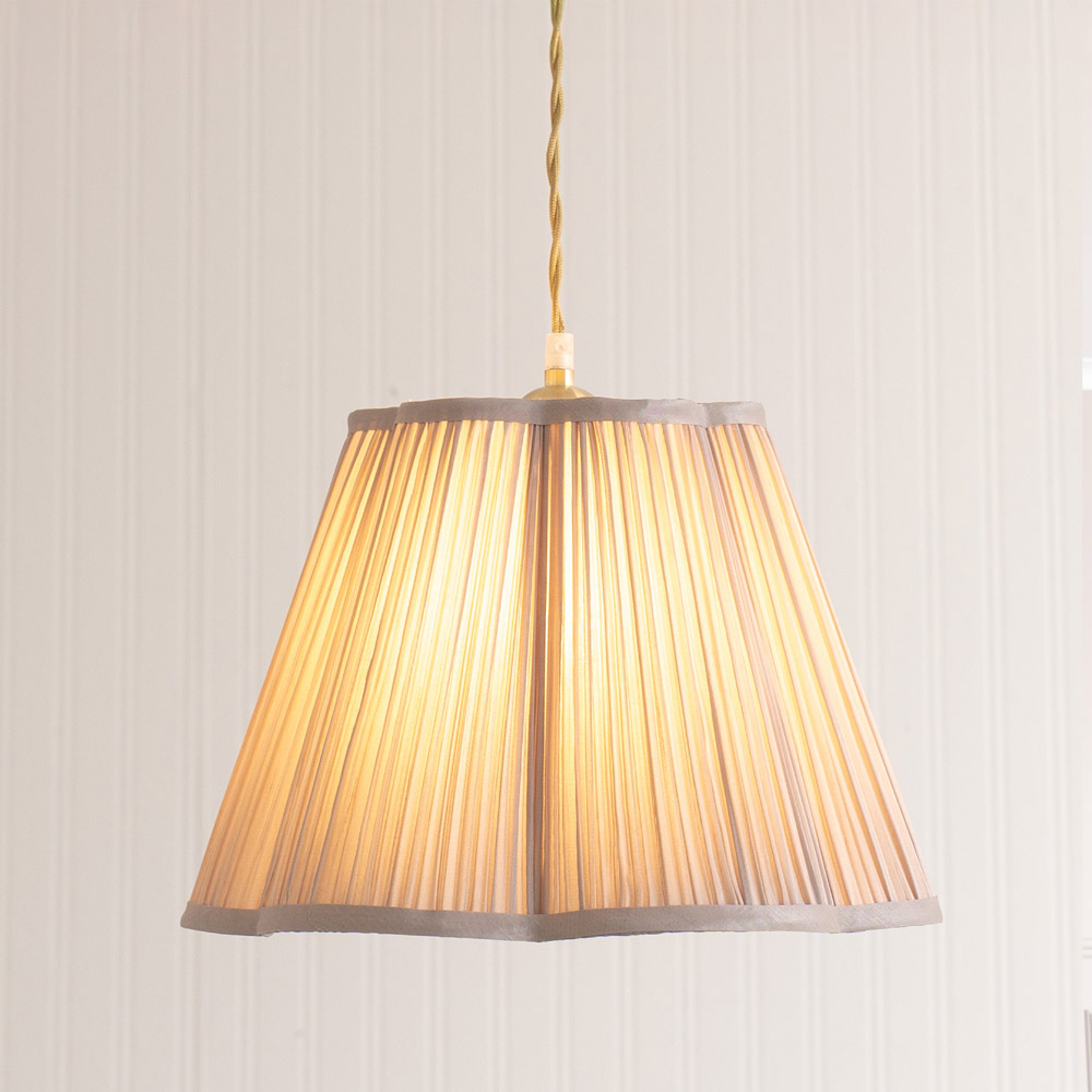 Introduce an element of sophistication to your living space with the Loralei Light Grey Large Pleated Faux Silk Scalloped Easy Fit Lamp Shade. Fashioned from luxurious faux silk, this lampshade boasts elegant pleats and a stylish scalloped edge. Its light grey colourway introduces a contemporary feel, ideal for those seeking to inject a touch of glamour and drama into their décor. Suitable for use with either a floor lamp or suspended from the ceiling, this shade is guaranteed to elevate your home's aesthetic.