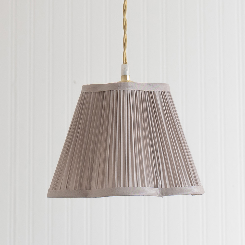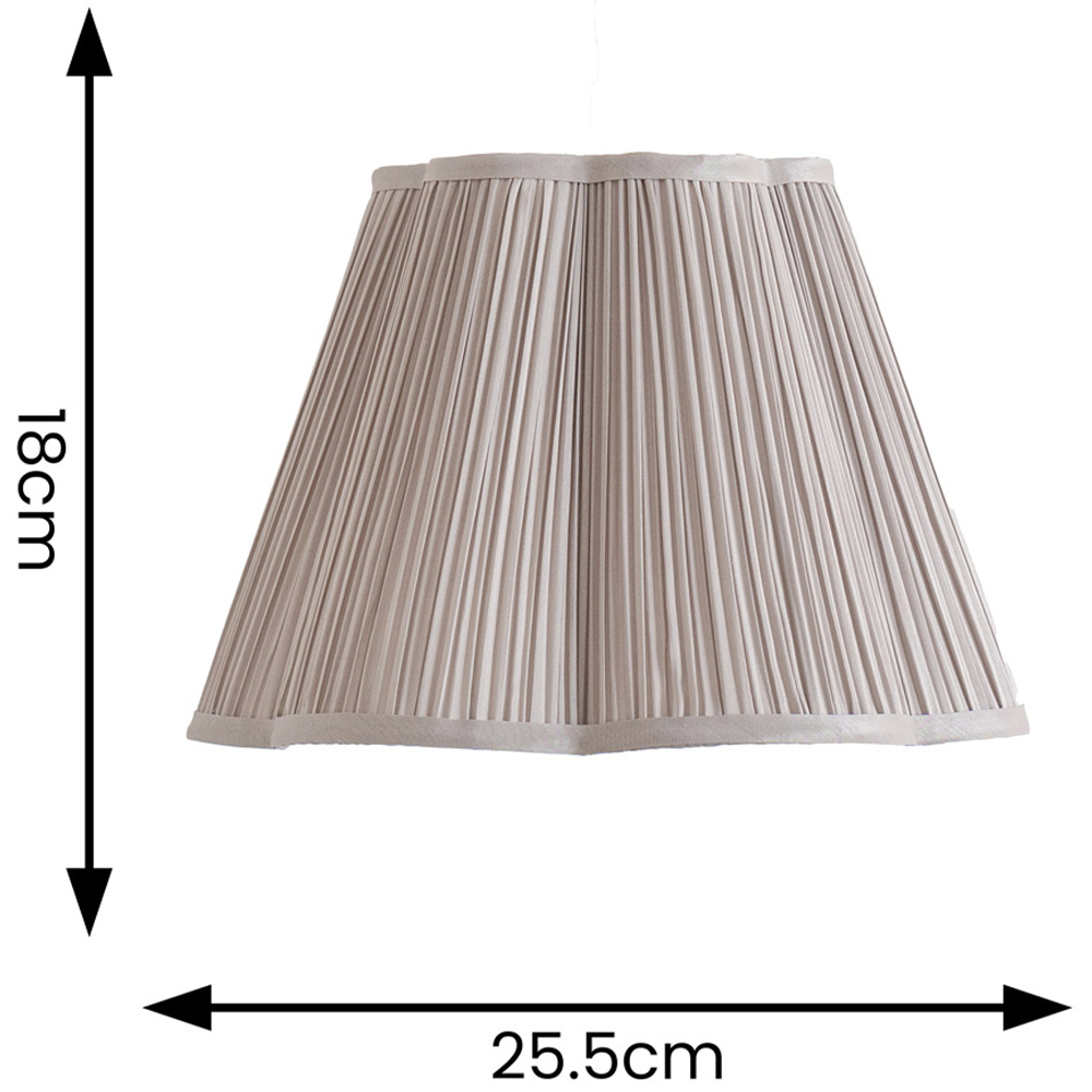 Introduce a touch of elegance to your living space with the Loralei Light Grey Small Pleated Scalloped Easy Fit Lamp Shade. Crafted from luxurious faux silk, the delicate pleats and light grey hue offer a sophisticated, contemporary update to any room. The scalloped edges add a charming detail, making it ideal for creating a chic ambiance in your bedroom or living room. This easy-fit shade not only enhances your lighting but also transforms your décor.