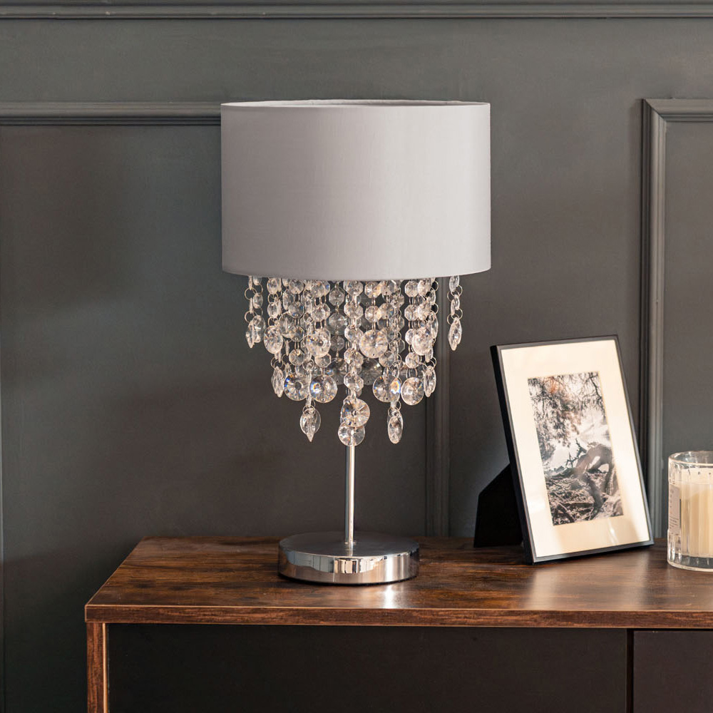 A statement piece for any room, this lamp features a striking chrome stand and a sophisticated grey drum shade, adorned with intricate clear jewel droplets suspended beneath. Perfect for casting a warm, ambient glow, this beautifully crafted lamp instantly transforms your space.