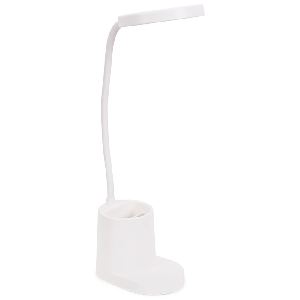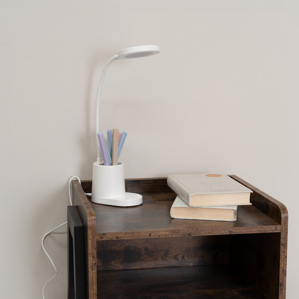 Enhance your workspace with the Marco rechargeable dimmable desk lamp, a petite addition in a clean white finish. Its flexible gooseneck and three adjustable light temperatures provide adaptable illumination. A built-in pen pot adds convenient organization. Dimensions: H47 x W12.8 x D9.8cm.