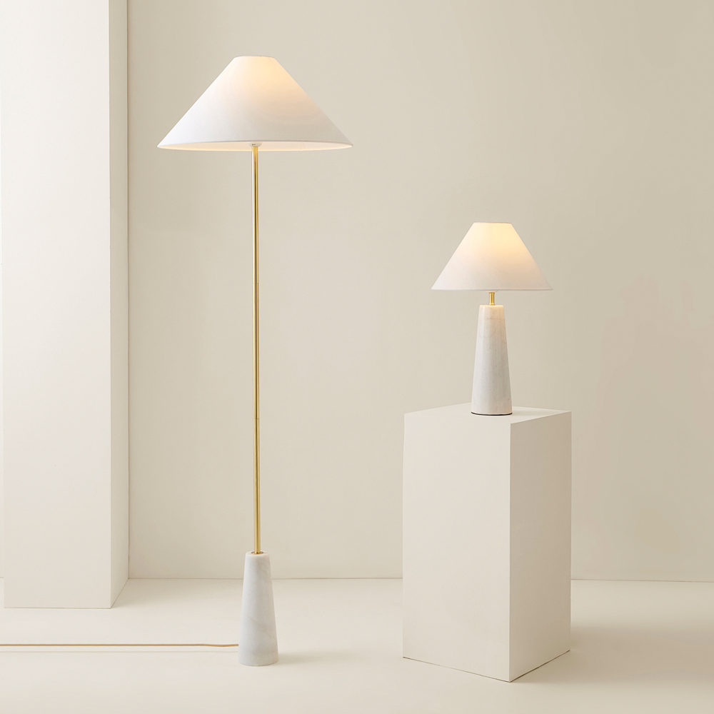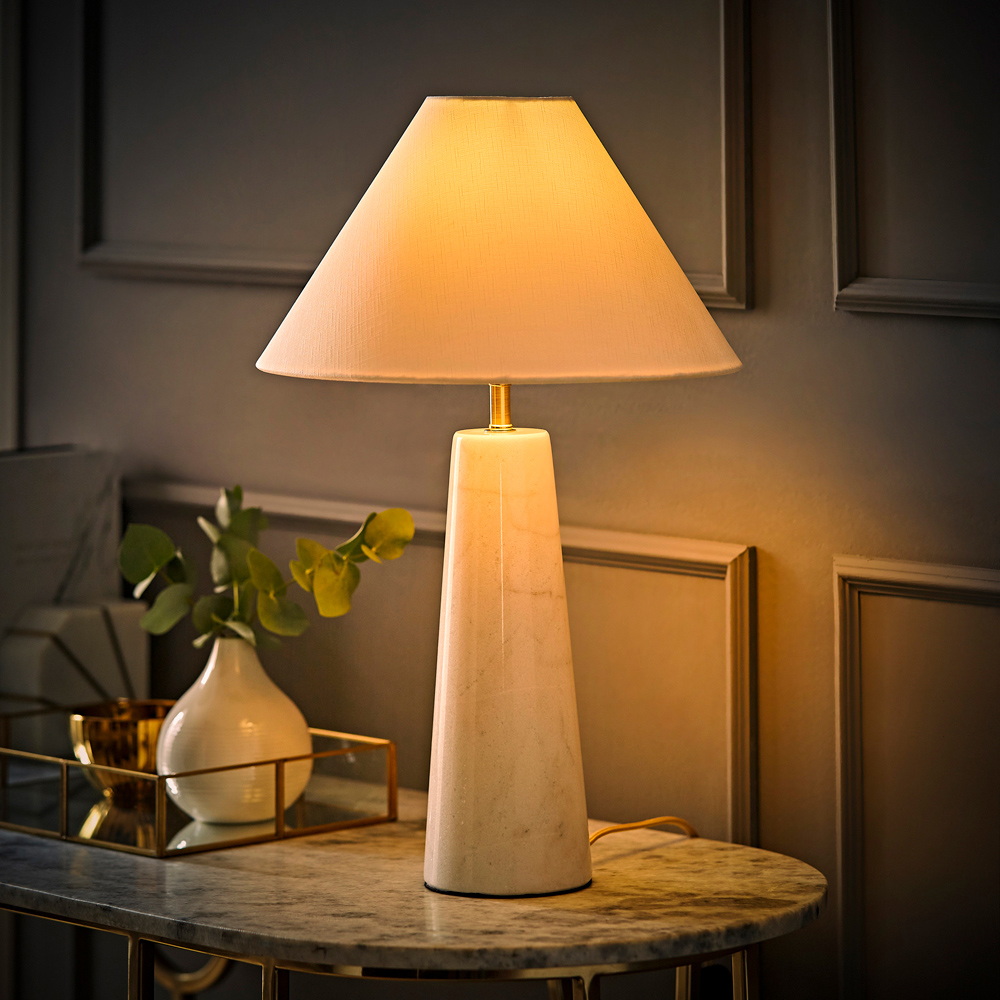 Elevate your space with this exquisitely crafted lamp. A striking combination of a solid marble base and a tapered fabric shade creates a warm, inviting ambiance. The linen shade diffuses light beautifully, casting a cosy glow. This minimalist and modern design, featuring natural materials, is a perfect blend of contemporary style and timeless elegance.