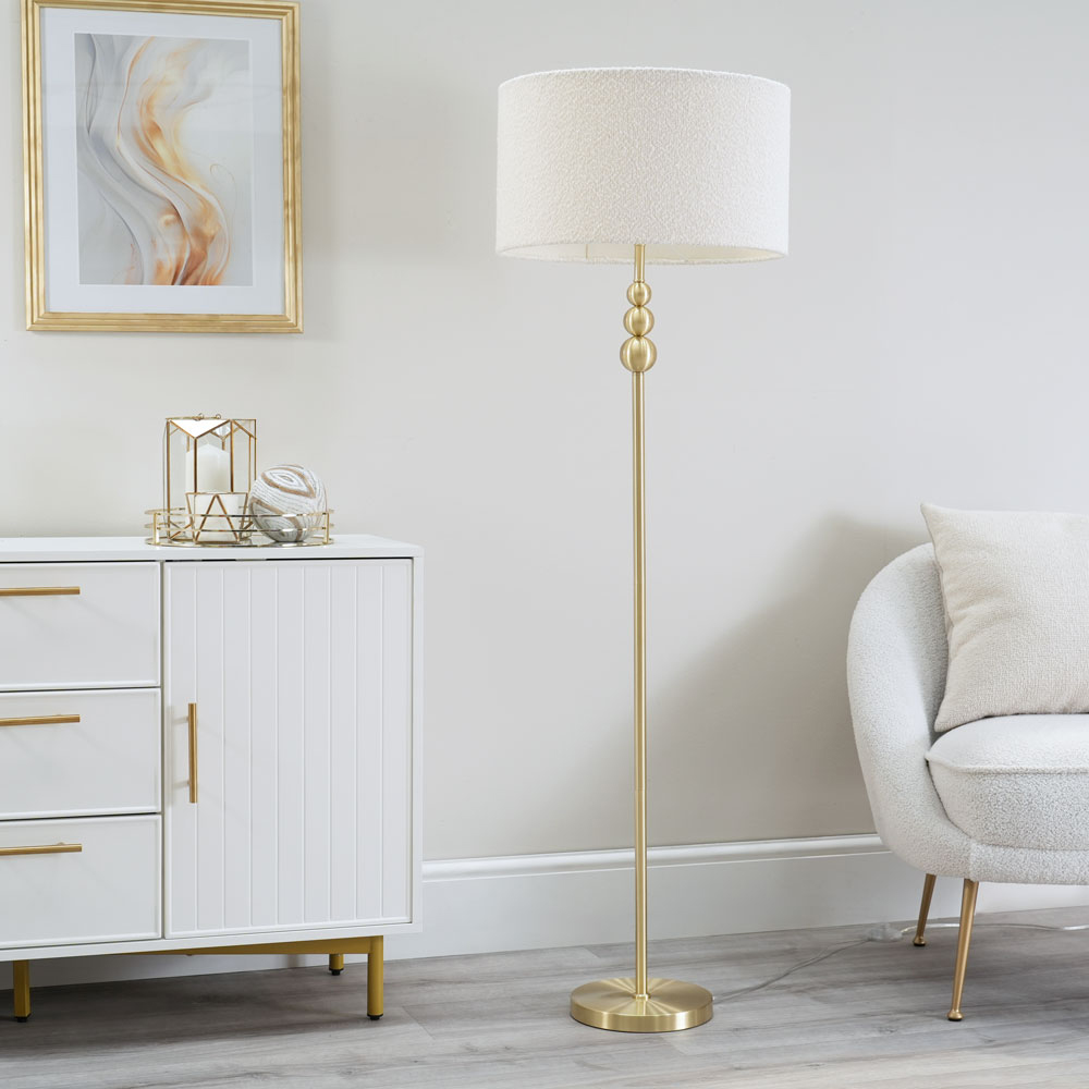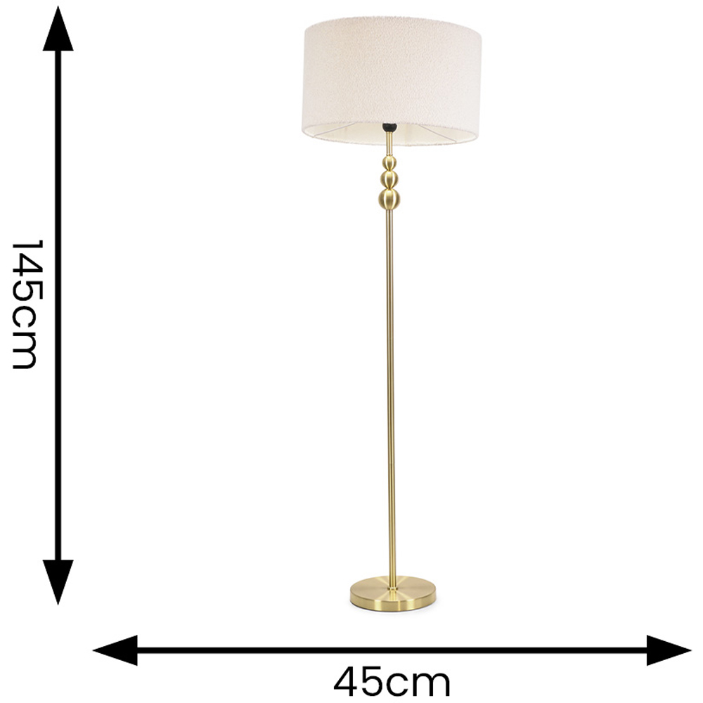 Enhance your living space with the Marissa Reni Cream Boucle Shade and Gold Ball LED Floor Lamp. This elegant floor lamp boasts a slim profile, ideal for any corner of your home, emitting a warm and stylish glow. The unique brushed gold stacked ball design adds a touch of captivating detail, beautifully complemented by the stylish shade. Perfect for living rooms, bedrooms, or home offices, this freestanding lamp is easy to clean with a dry cloth and includes a 12-month warranty. An LED bulb is included.