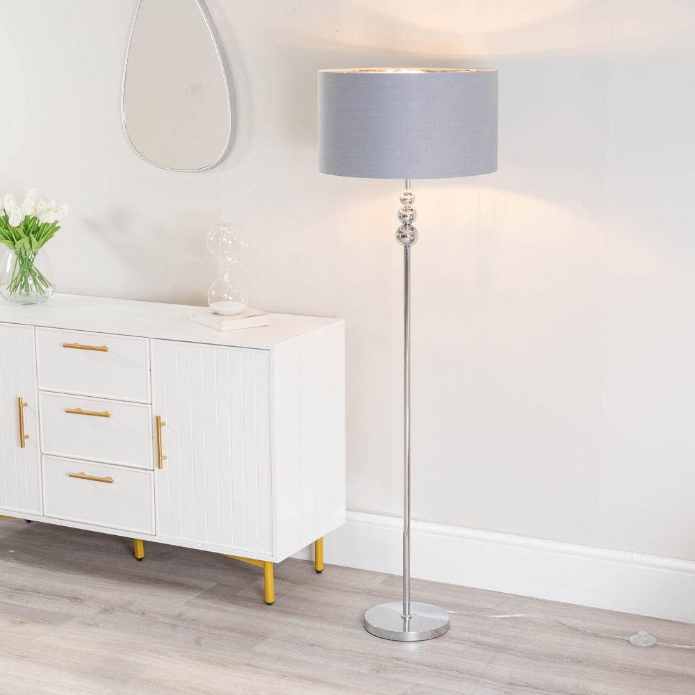 Illuminate your living space with the Marissa Reni LED floor lamp. This elegant lamp features a slim profile, perfect for smaller corners, and a unique stacked brushed gold ball design that adds a touch of modern sophistication. The stylish grey shade complements the warm, inviting light emitted by the integrated LED bulb. Easy to maintain with a simple dry wipe, this freestanding lamp is ideal for living rooms, bedrooms, or home offices and includes a 12-month warranty.