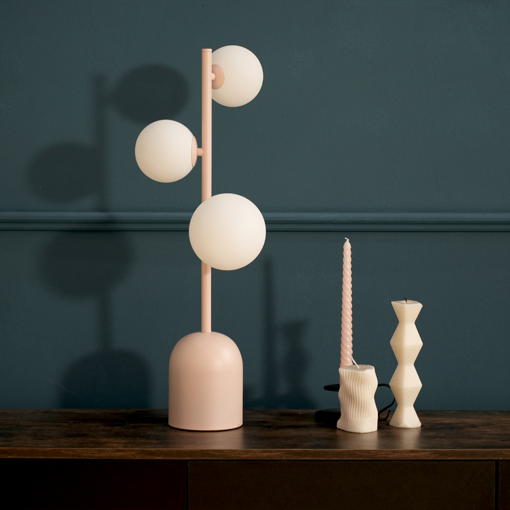 Elevate your home's ambiance with this statement table lamp. Its blush-toned metal stem and three opal glass globe shades create a warm, inviting glow. The opal glass shades offer a warm glow of light, perfectly complementing the metal base. This chic design is a perfect accent piece for any living space, adding both style and illumination.