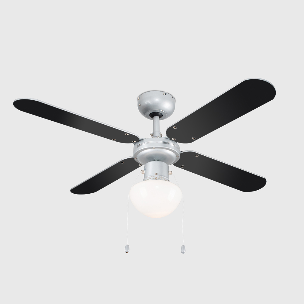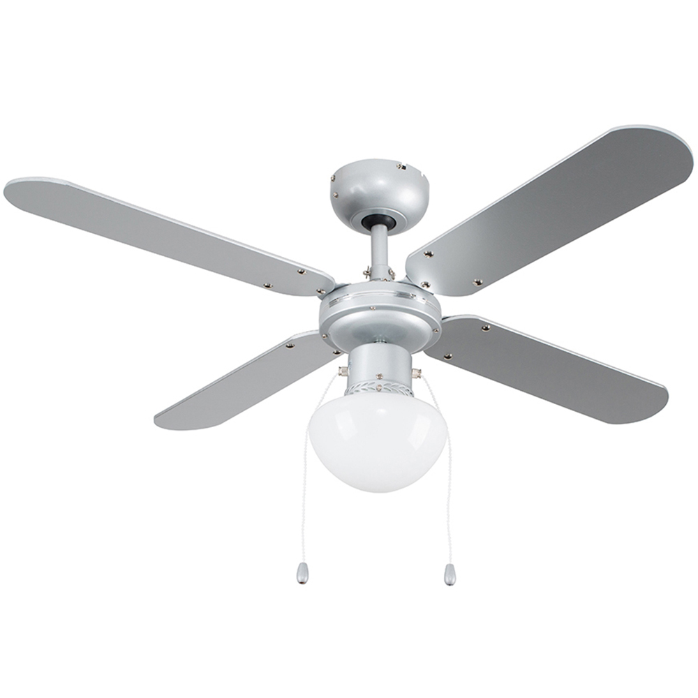 Illuminate your home with the elegance of a ceiling fan with the ValueLights Mirage 42 inch Ceiling Fan in silver. Featuring four reversible blades, a reversible motor and a sleek opal glass shade, it’s built for year-round comfort. Pull cords give you easy control of the fan and light. Takes one 50W ES/E27 bulb or LED equivalent. Total energy use: 100W. Weighs 4kg. Install at least 2.3m above the floor on a solid beam that supports 60kg. Style and safety, sorted. Dimensions: H43 x W102 x D102cm.