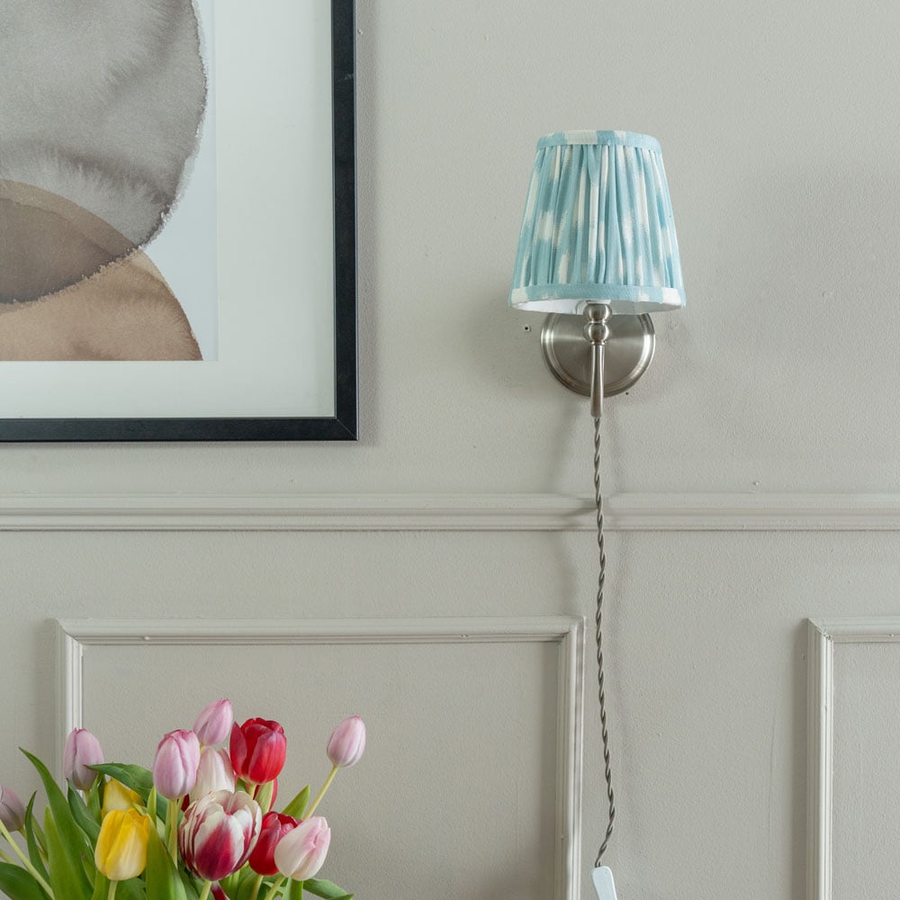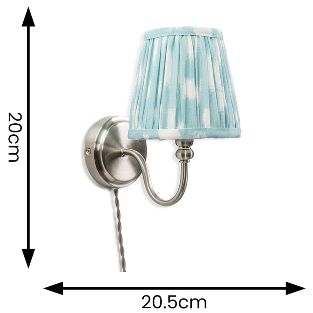 A classic design reimagined. This wall light pairs brushed chrome metal with a pleated blue fabric shade for a touch of modern charm in any room. The high-quality materials and timeless design make it perfect for a home office, bedroom, or reading nook. Simply plug it in and enjoy the convenience of the in-line rocker switch on the twisted cable. Sold as a pair. Dimensions: H20.5 x W14 x D20cm.