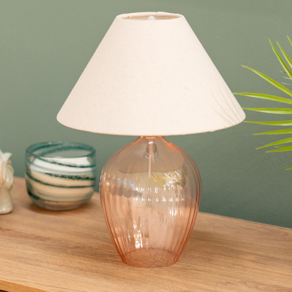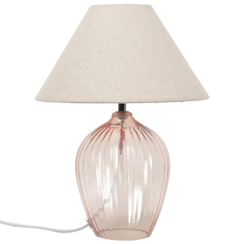 Elevate your space with this stylish table lamp. Its blush pink glass base and natural fabric tapered shade create a contemporary yet warm ambiance in bedrooms, living rooms, or offices. Conveniently controlled by an in-line rocker switch, this lamp offers both functionality and visual appeal, becoming a striking focal point in any room.