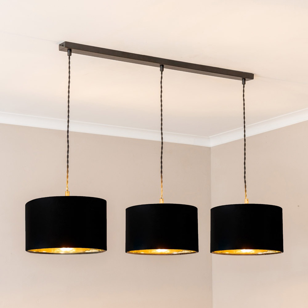 It's all in the small detail! Complete your dream lighting look with our Reni Black & Gold Drum Shade 3 Drop Bar Black Diner Ceiling Light and LED Bulbs. This stylish and sturdy matte black 3-drop bar E27 lamp holder features three on-trend black shades with gold inners, perfect for adding an industrial edge and a modern feel to any room. Ideal for pendant lighting, this ceiling light is easy to install, ensuring you can add a touch of charm instantly. Whether aiming for a sleek loft look or a warm cafe vibe, this bar lamp holder is guaranteed to garner admiration from your guests.