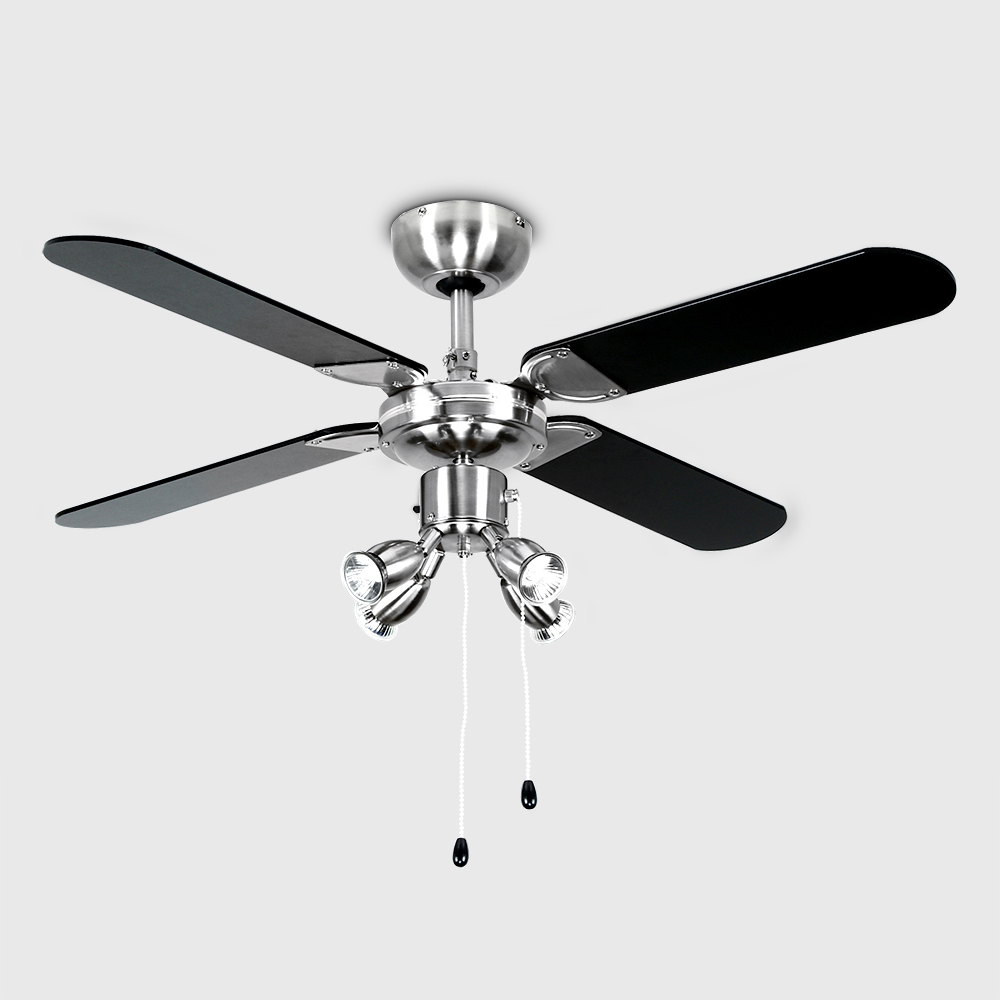 Say goodbye to stuffy spaces with the ValueLights Scimitar 42 inch Ceiling Fan with Spotlights in brushed chrome and black. Featuring four reversible blades for year-round comfort, pull cords for easy control, and a reversible motor. It weighs 4.66kg and takes four 50W GU10 bulbs. Energy use: 250W total (fan 50W, bulbs four 50W). Ceiling fans need to be at least 2.3m above the floor for safety. Fix to a solid beam able to hold 60kg, never plasterboard, so your fan spins smoothly and securely. Safety first, breezy later. Dimensions: H39 x W102 x D102cm.
