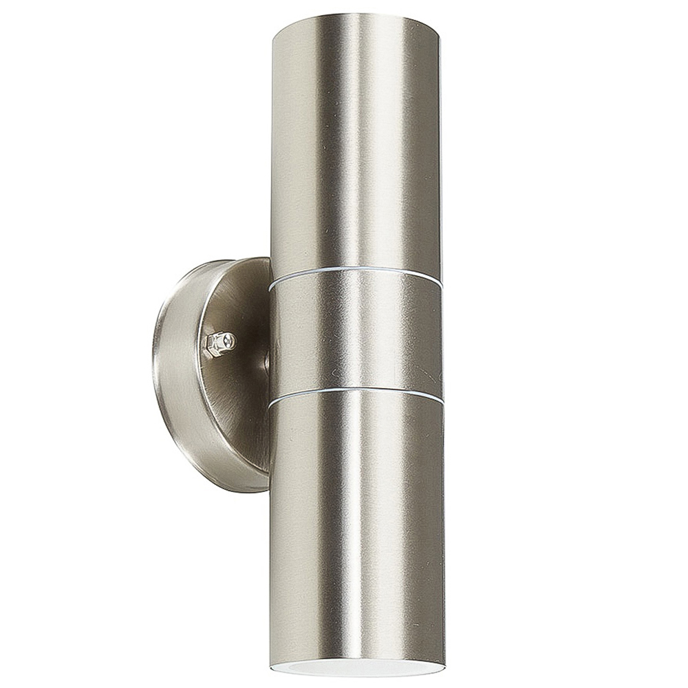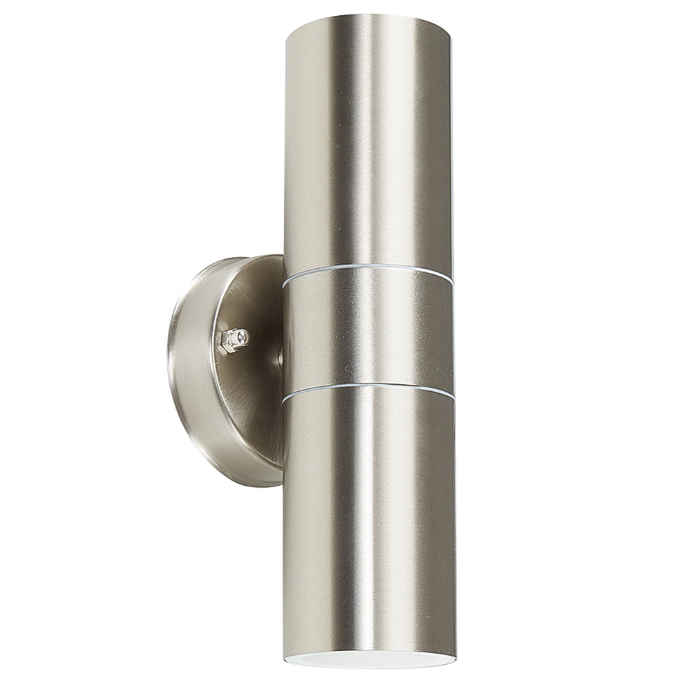 Illuminate your home's exterior with this stylish silver outdoor wall lantern. Crafted from modern stainless steel, this up and down light casts a warm glow, perfect for enhancing entrances, porches, and walls. Ideal for gardens, driveways, patios, and garages, it provides both ambiance and security lighting. The IP44-rated, weatherproof design ensures reliable performance, while the integrated three-watt GU10 LED bulbs with dusk-till-dawn sensor technology automatically switch on at 10 lux and off at 15 lux, saving energy and providing convenient, automatic illumination.