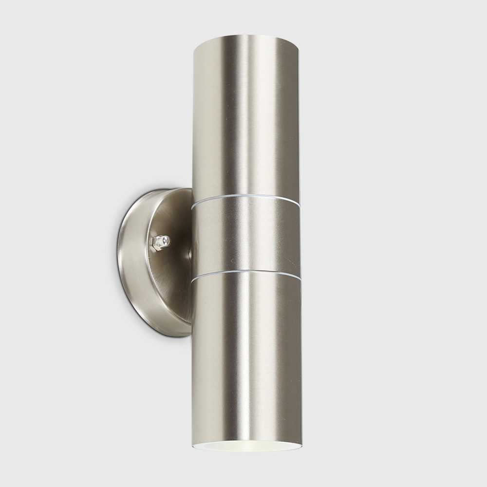 Illuminate your home's exterior with the stylish Silver Outdoor Wall Up Down Light. This modern chrome-finished lantern provides a warm, inviting glow, perfect for entrances, porches, and external walls. Ideal for enhancing security and style in gardens, driveways, patios, and garages, this weatherproof fixture is IP44-rated for outdoor use. Light is emitted from both the top and bottom. The fixture includes two five-watt warm white LED bulbs, ready for immediate installation.