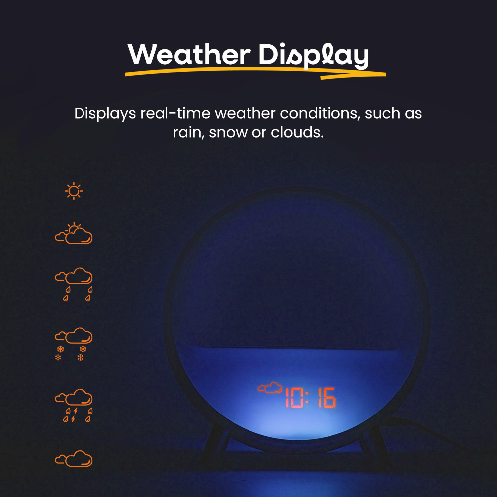 Wake up serenely with the Smart App-Control Sunrise Alarm Clock and Nightlight Table Lamp. This innovative alarm clock gently illuminates your room before your alarm, mimicking a natural sunrise. Enjoy convenient features such as snooze, weather display, sleep aid settings, adjustable brightness, and separate weekday/weekend alarms. The built-in Bluetooth speaker lets you play your favourite music, while the wireless charging pad (up to 15W) powers your smartphone or AirPods. Control everything via the Smart Life app or with voice commands using Alexa and Google Home. Choose from 11 lighting modes and 15 sound effects, and customize your ambiance with 16 million colours using the RGBIC chip. Dimensions: H20.5 x W22.5 x D21.5cm.