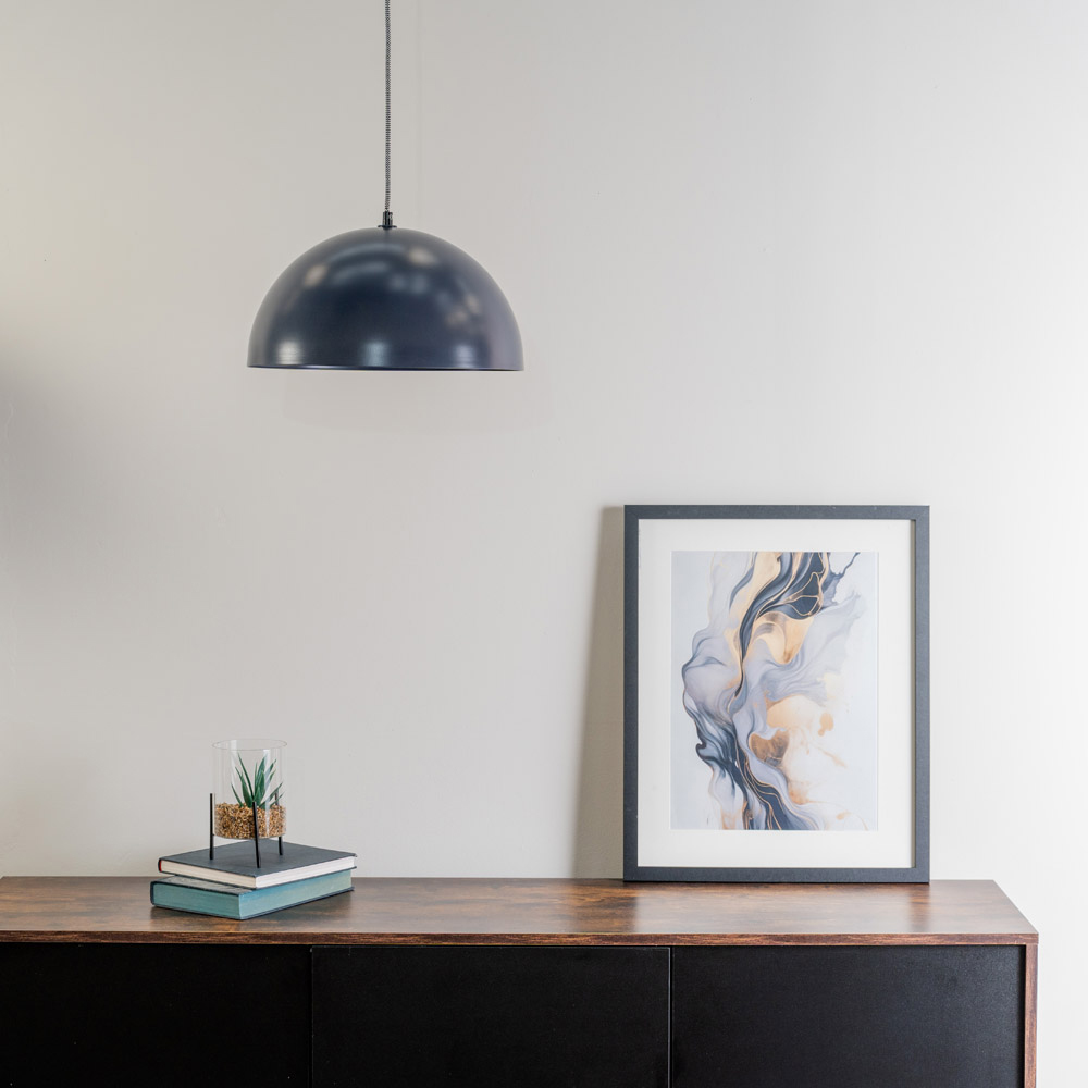 The Stassi Dark Navy Mushroom Dome LED Pendant Ceiling Light adds a touch of mid-century modern style to your home. Its unique mushroom-shaped dome shade casts a warm glow, perfect as a focal point in hallways, above bedside tables, side tables, or dining tables. Easy to clean with a dry cloth thanks to its smooth finish, this pendant light includes an energy-efficient LED bulb and is backed by a one-year warranty.