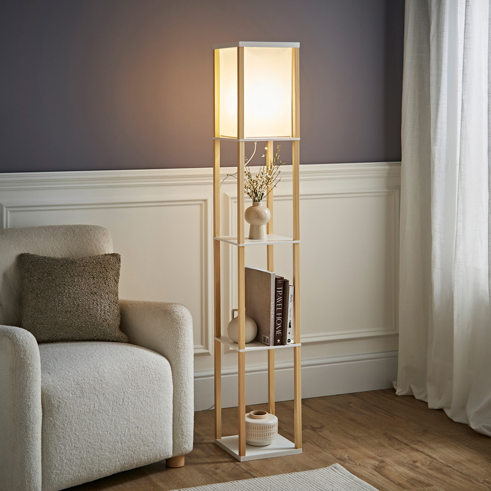 ValueLights Struttura 3 Shelf Oak Shelving Unit Floor Lamp with Fabric Shade