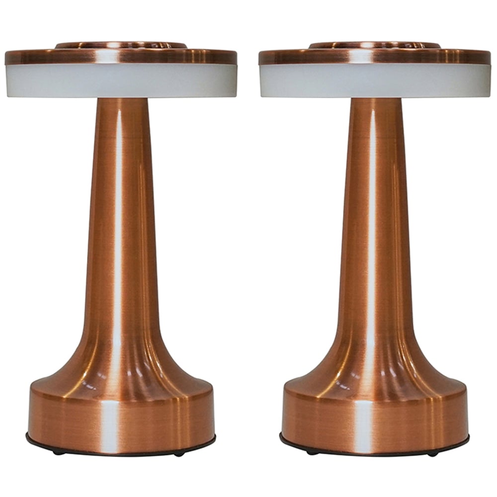 Illuminate your home with this stylish pair of copper LED table lamps. Their sleek metal design offers four brightness settings: low, medium, high, and off, providing versatile lighting options. Conveniently cordless, each lamp boasts a rechargeable battery and includes a 1.2m USB charging cable with a helpful indicator light. Perfect for bedside tables or any space lacking a nearby power outlet.