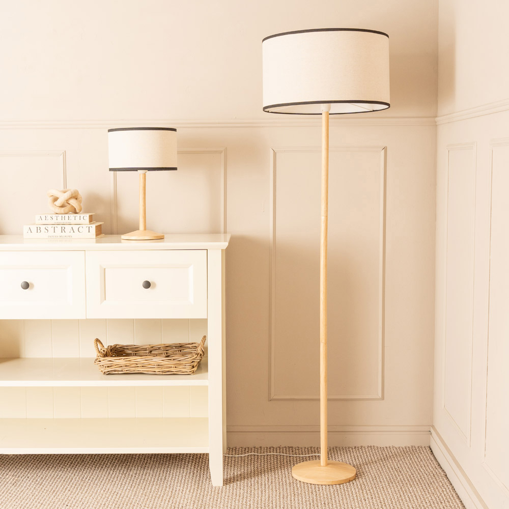 ValueLights Triston Linen Black Edge Drum Shade Natural Light Wood Stem LED Table Lamp