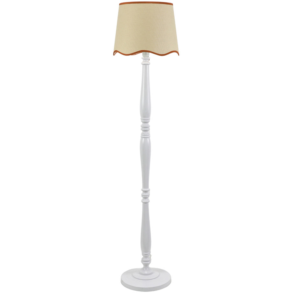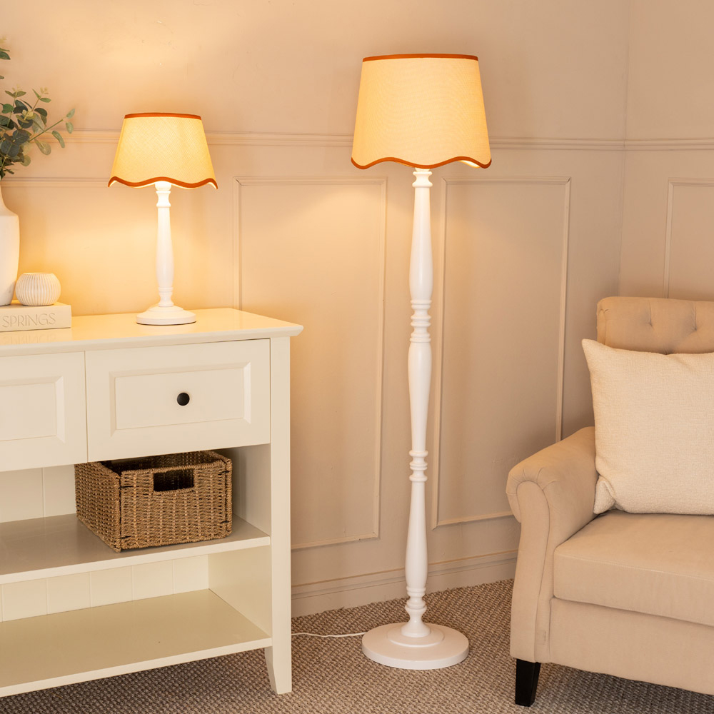 A classic and stylish floor lamp, the Victoria White Wood Floor Lamp complements both modern and traditional interiors. Its elegant candlestick-style wooden base pairs beautifully with the natural linen scalloped shade, accented with a subtle rust trim. The 1.8m cable features a convenient in-line foot switch. Complete with a suitable LED bulb and a 12-month warranty, this lamp (H152 x W35 x D35cm) offers both practicality and timeless design.