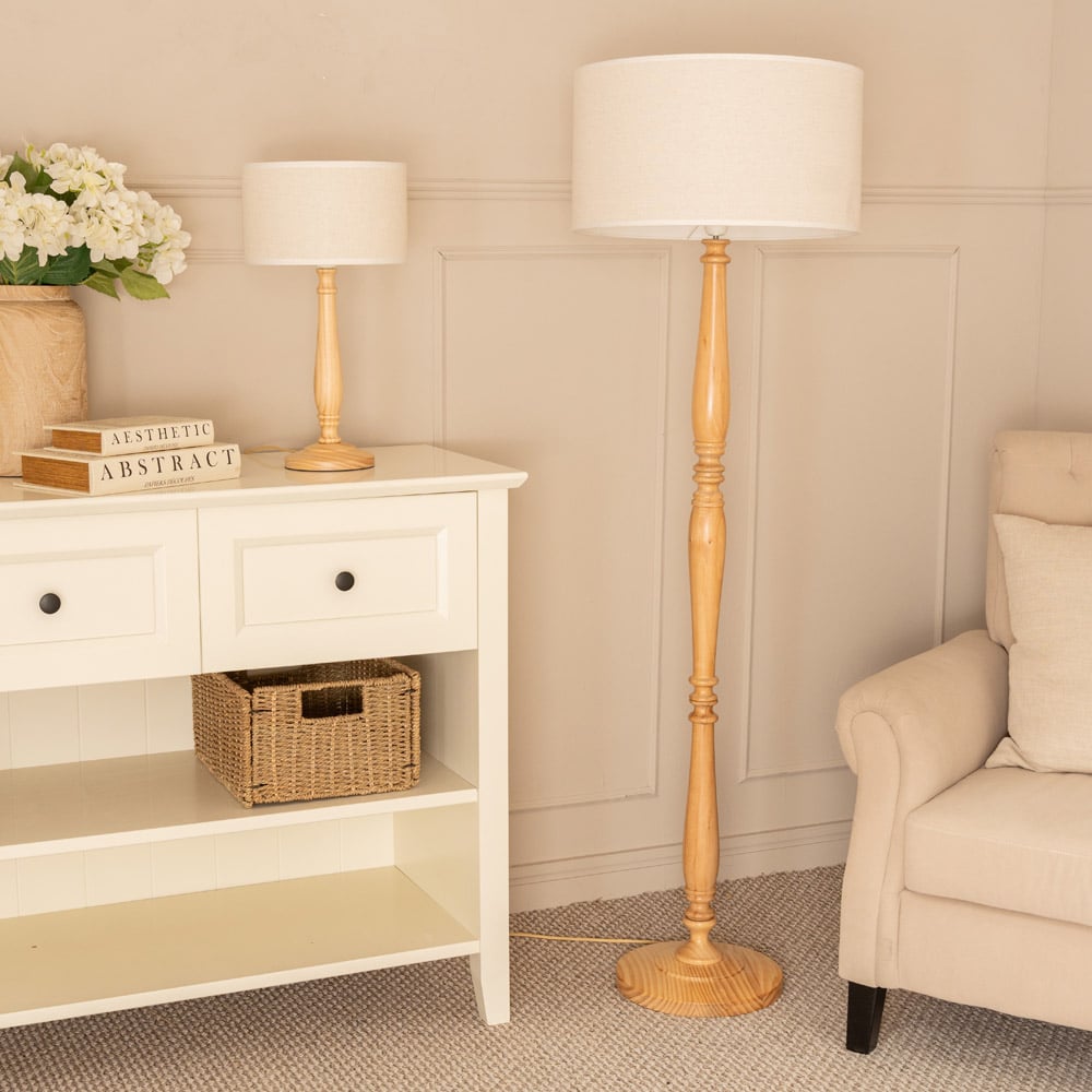 A stylish and versatile addition to any home, the Victoria floor lamp effortlessly blends classic and contemporary design. Its turned light wood base provides a solid foundation for the elegant linen drum shade, accented with crisp white trim. The 1.8m cable with convenient in-line foot switch ensures user-friendly operation. Complete with an energy-efficient LED bulb and a 12-month warranty, this lamp (H149 x W45 x D45cm) is perfect for living rooms, bedrooms, and more.