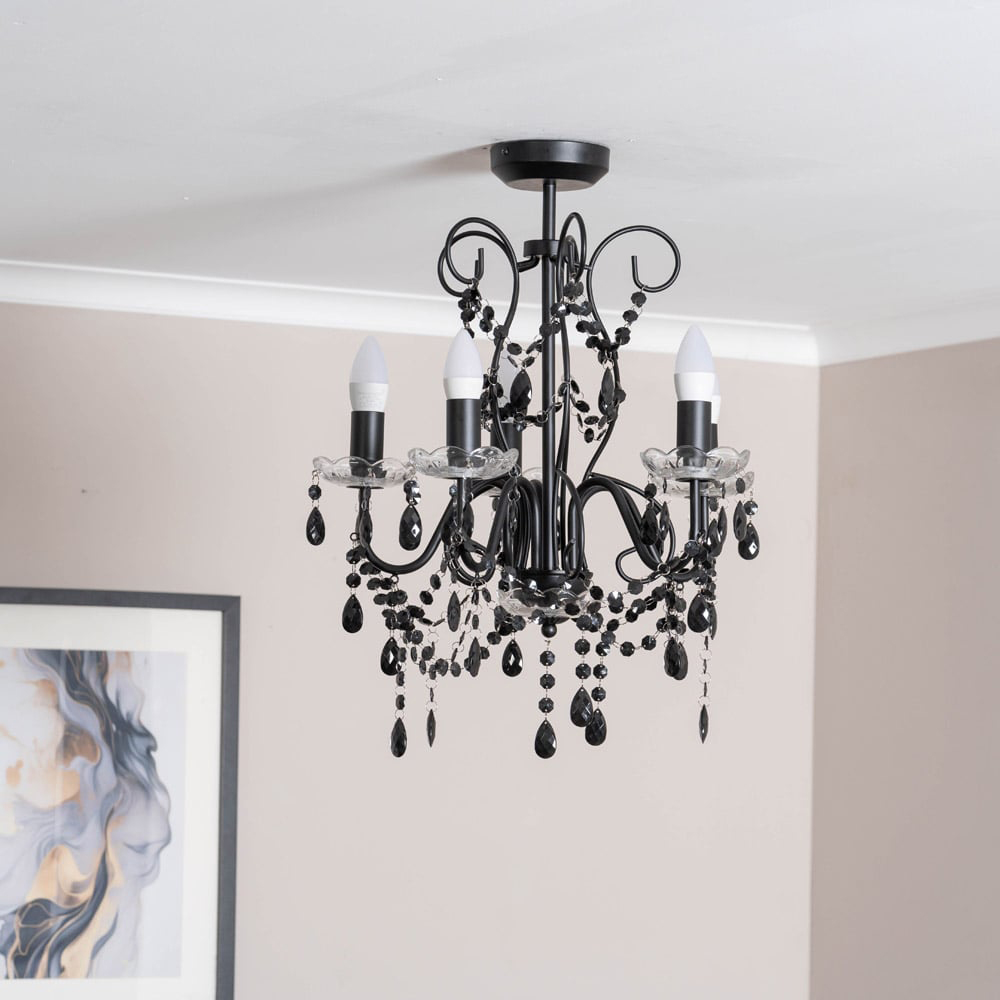 The Viscount 5-Way Black Jewel Chandelier LED Pendant Light: a contemporary twist on classic elegance. Perfect for high ceilings, this striking chandelier adds sophistication to any space. Its black jewel finish requires only a dry cloth for cleaning. Includes LED bulbs and a 12-month warranty.