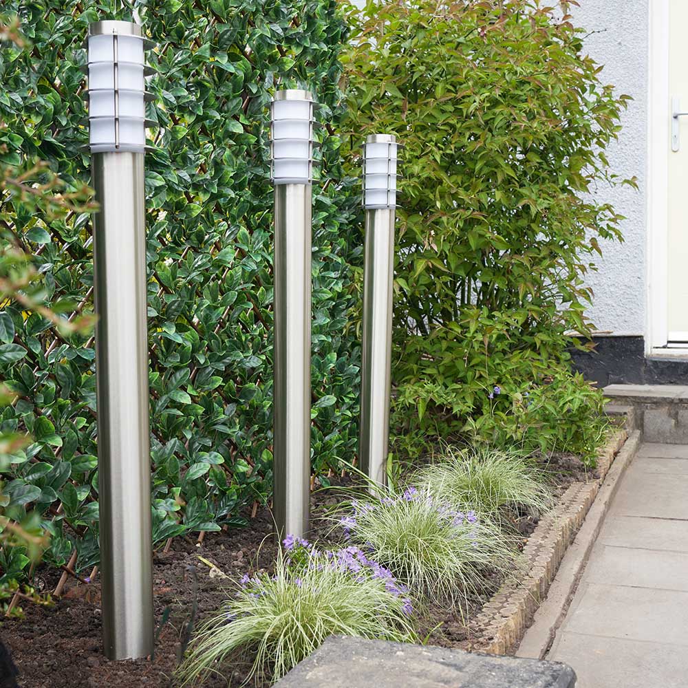 Enhance your garden's appeal with this pair of stylish 1m high silver bollard lights. Crafted from stainless steel with frosted white shades, these modern lights offer a sophisticated look, ideal for pathways or illuminating darker areas. Their weatherproof (IP44 rated) design ensures durability and security, while the integrated 4W warm white LED bulbs provide instant, ambient lighting. Ready to install and enjoy, these elegant lights add a touch of class to any outdoor setting.