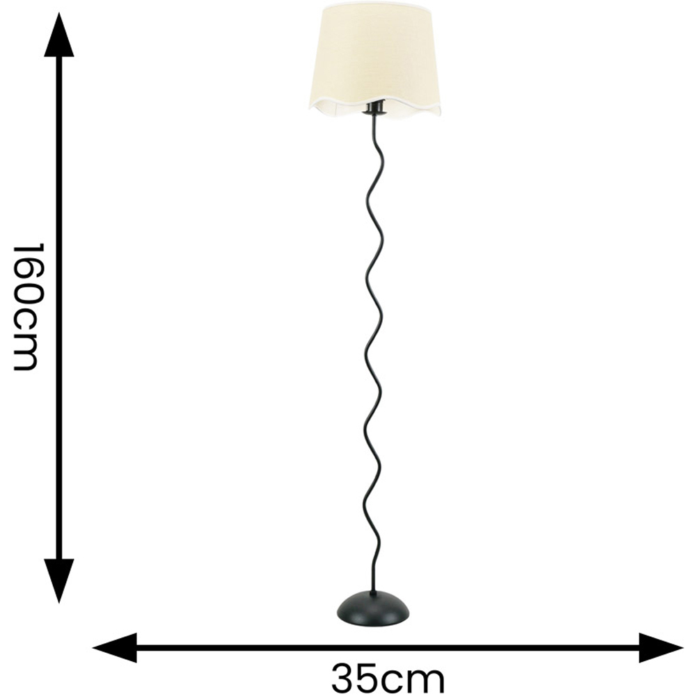 Elevate your home's style with this eye-catching ValueLights Wiggle floor lamp. A sleek black metal base provides a contemporary foundation, beautifully complemented by a natural linen shade with scalloped edges and crisp white trim. The shade's unique shape echoes the lamp's playful base, creating a cohesive and stylish design statement. Standing at 160cm tall with a 35cm width and depth, this ready-to-use lamp includes an LED bulb and is covered by a 12-month warranty. A perfect blend of form and function for modern interiors.